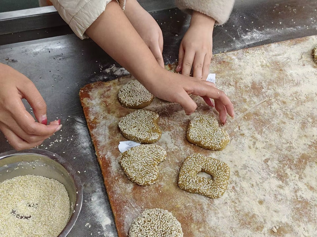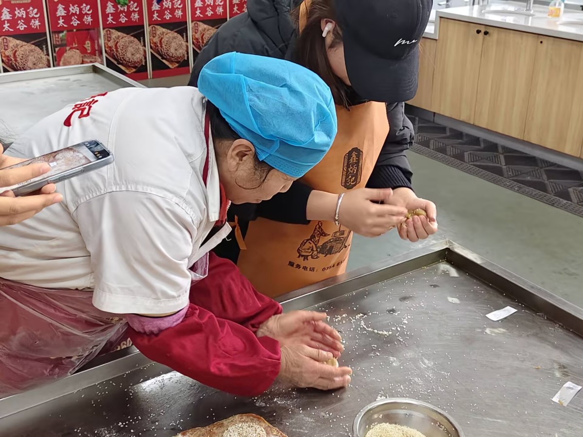 非遗传承人端坐台前,指尖翻飞间,面团历经“揉、擀、包、烤”的古法淬炼。