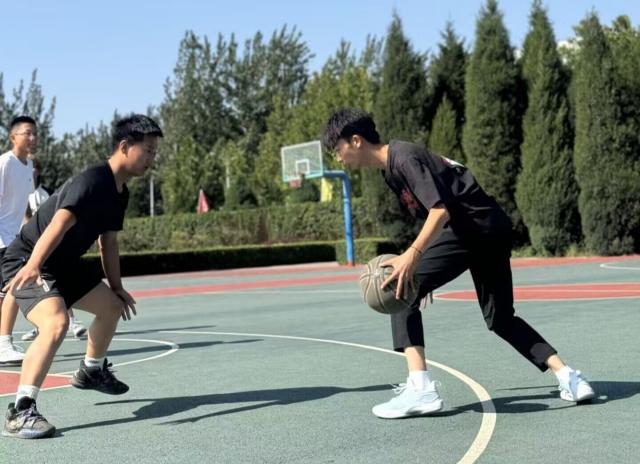 了解动作要领之后,同学们纷纷实践起来,每一位球员都是球场上不甘落后的阳刚男儿,一次次地练习技巧——带球、运球、颠球、传接球等各路球。在他们的字典里没有“认输”,两腿用力,一蹬,一蹲,一跃,他们心中有着坚定的信念,脚下步伐沉稳,迅速起跳,缓缓落地。场地是他们展示的舞台,如弓箭一般蓄势待发。汗水渗出头发,顺着脸颊在挥洒,在太阳的照耀下,随处可见新生健儿们的飒爽英姿。