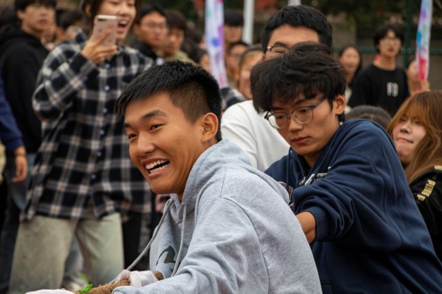 一声哨响,麻绳绷直,仿佛一条无形的纽带,将两队人的心紧紧相连,又狠狠撕裂。肾上腺素急速飙升,惊人的爆发力似要撼动大地;青筋暴起,他们的目光里写满了坚定。观众席上,加油声、呐喊声此起彼伏,全场人的目光紧盯绳子中央那决定胜负的标志,一次次的“一,二,拉!”,一次次的向后倾倒,长而响的哨声骤响。他们用实际行动证明什么叫团队精神,什么是竞技体育,燃情永存。