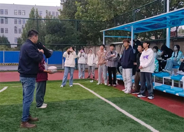 随后,在杜素鹏老师的带领下,大家开始了充满活力的热身运动,为接下来的橄榄球训练做好了充分的准备。杜老师就英式橄榄球的相关内容做出了详细的讲解,化身成为橄榄球知识的传播者,介绍了球的由来和简单传球比赛方法,同学们听得津津有味,不时提出疑问,杜老师则耐心解答,现场气氛热烈而活跃。