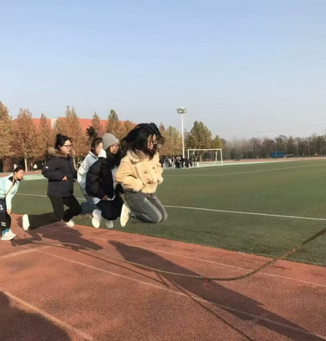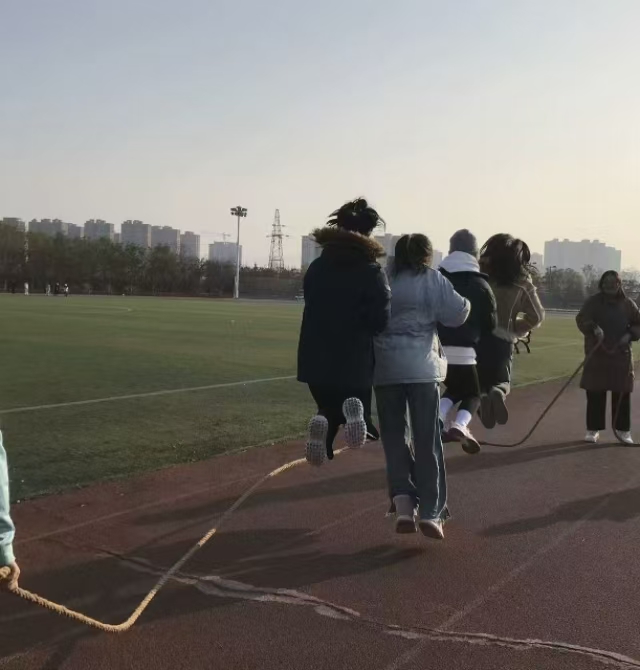 紧接着来到了跳大绳项目。本场活动内容需两名参赛队员拉绳,其余队员跳绳,需连跳五个不中断方可通过。同学们身轻如燕,动作统一展现了惊人的默契和协调性。即使中断重来,队友之间也丝毫没有抱怨,互相鼓励,一起加油。他们配合着跳绳的节奏,轻快地跳动着。同学们的欢声笑语与夕阳交织在一起,让他们在学习压力中得到了一丝放松。