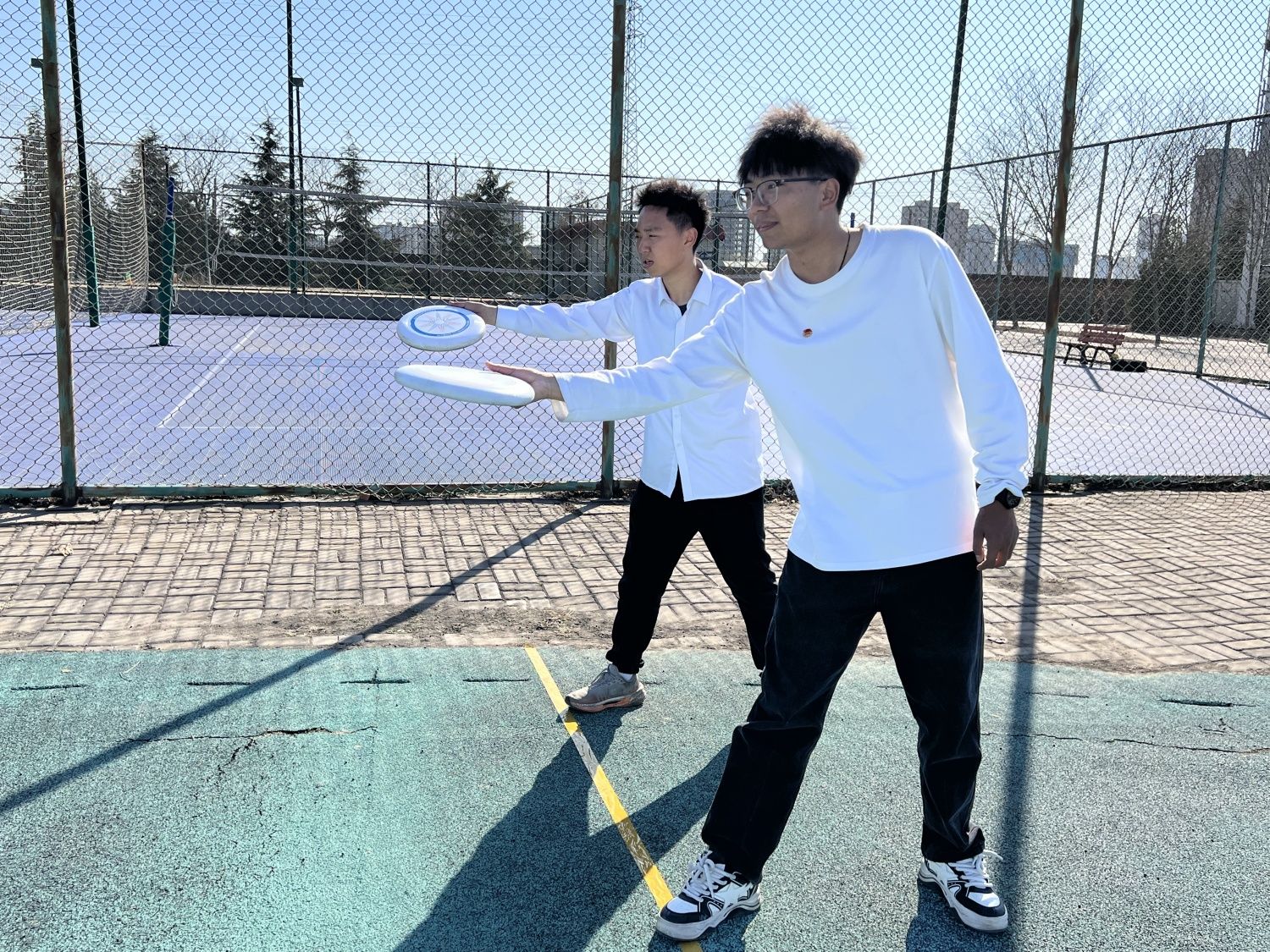 首项活动“飞盘争霸”激烈展开。两支队伍在长方形场地上展开对抗,目标是将飞盘传递至对方得分区。这不仅考验参与者的传盘技巧,更强调团队协作与配合。场边观众此起彼伏的呐喊声“快传!快传!”,同学们全神贯注,紧盯飞盘的轨迹。任潇同学接到飞盘后迅速转身,在10秒倒计时结束前将飞盘精准地传给了队友,成功突破对方防线,赢得一片喝彩。