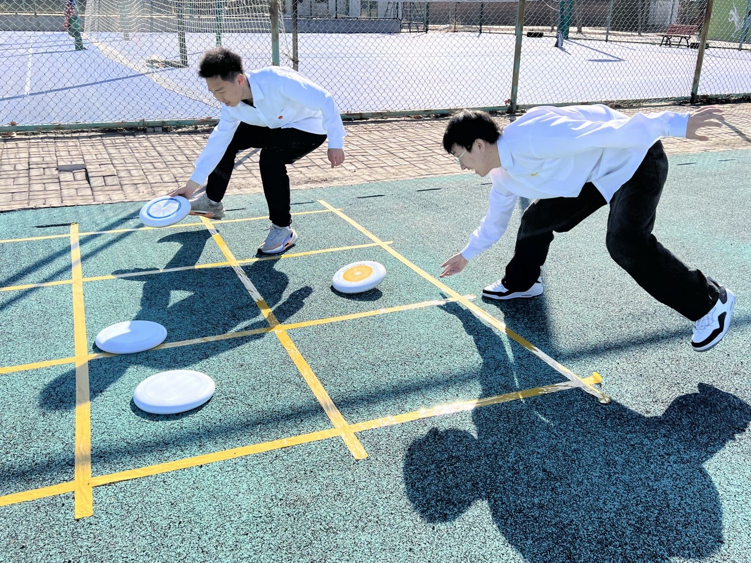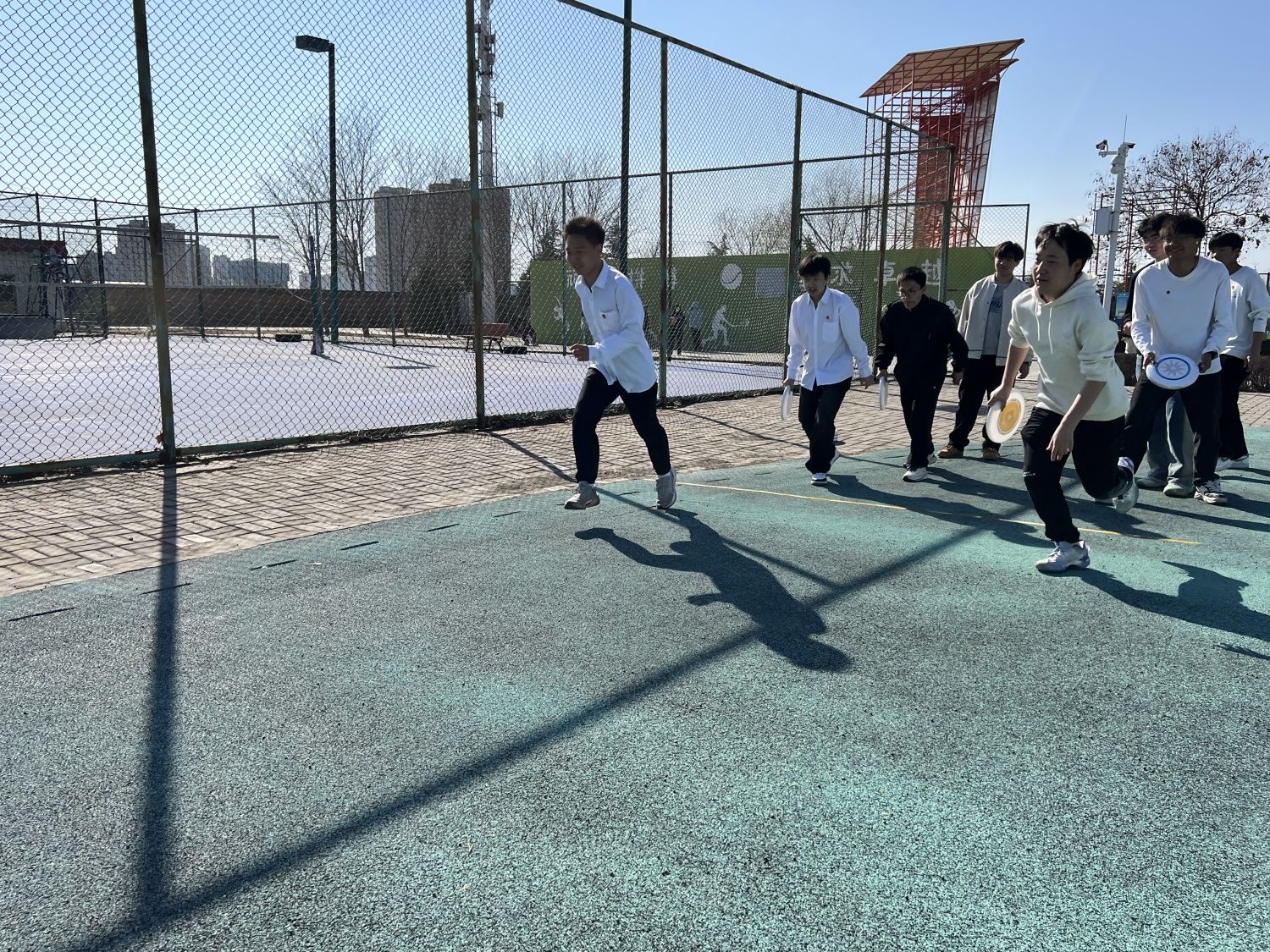 “勇气与速度的较量”将活动推向高潮。两支队伍面对面站立,相距约15米。一方用力将飞盘掷向对方,对方需徒手接住飞盘。这项活动不仅考验参与者的反应速度与手眼协调能力,更展现了勇气与团队精神。“接住!接住!”飞盘在空中划出一道弧线,郭辉同学迅速跃起,双手稳稳接住飞盘,场边瞬间爆发出热烈的欢呼声。飞盘飞速旋转,参与者全神贯注,每一次成功接盘都让人热血沸腾。