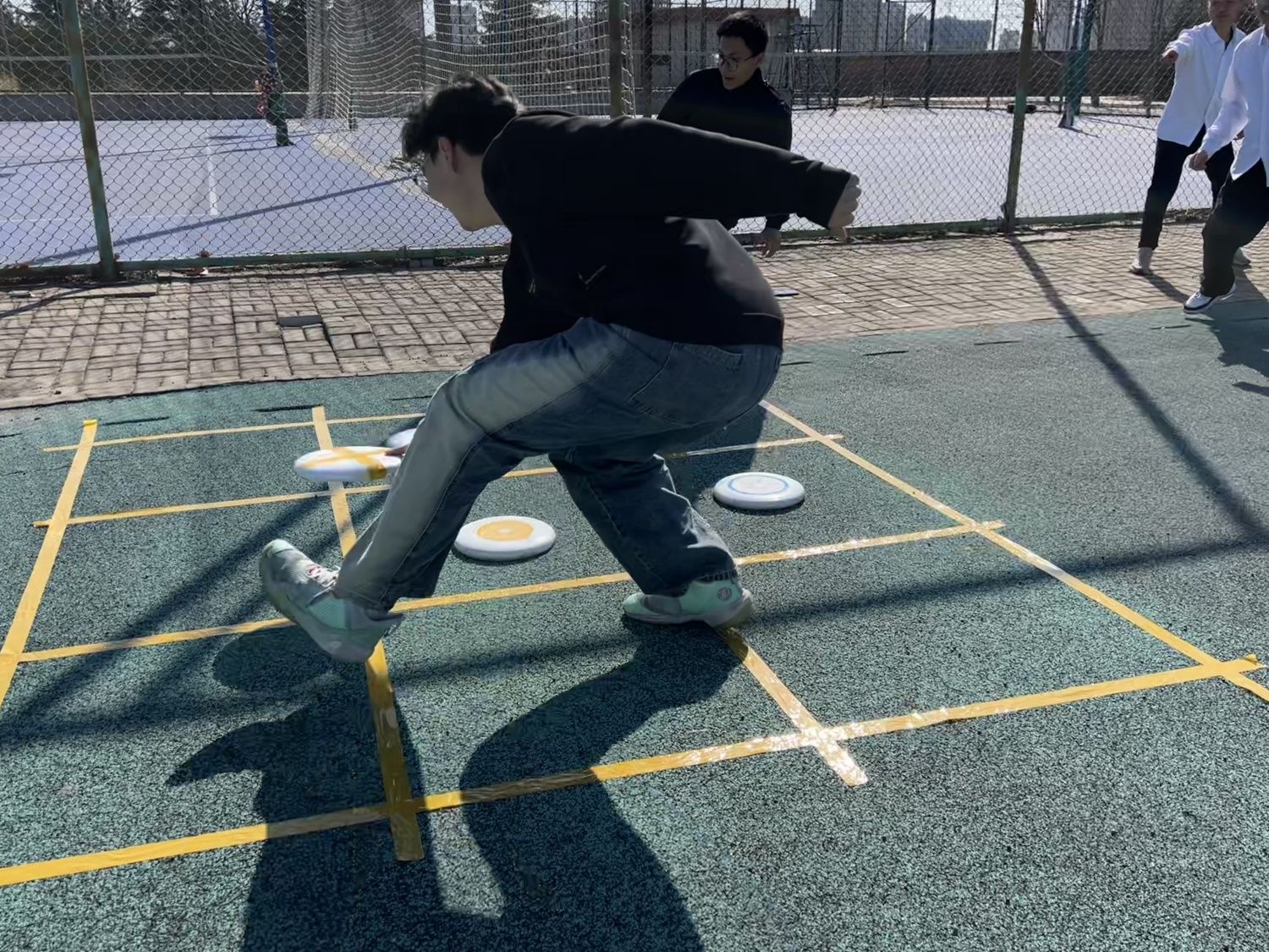 紧随其后的是“飞盘高尔夫”项目。与传统高尔夫类似,这项活动不仅考验参与者的投掷精准度,更要求他们对力度与角度的精确把控。“太棒了!一杆进洞!”李正阳同学在飞盘稳稳落入“篮筐”后兴奋地跳了起来,周围的队友纷纷上前击掌庆祝。现场气氛热烈而欢快,飞盘在空中划出优美的抛物线,每一次成功入筐都让人成就感爆棚。