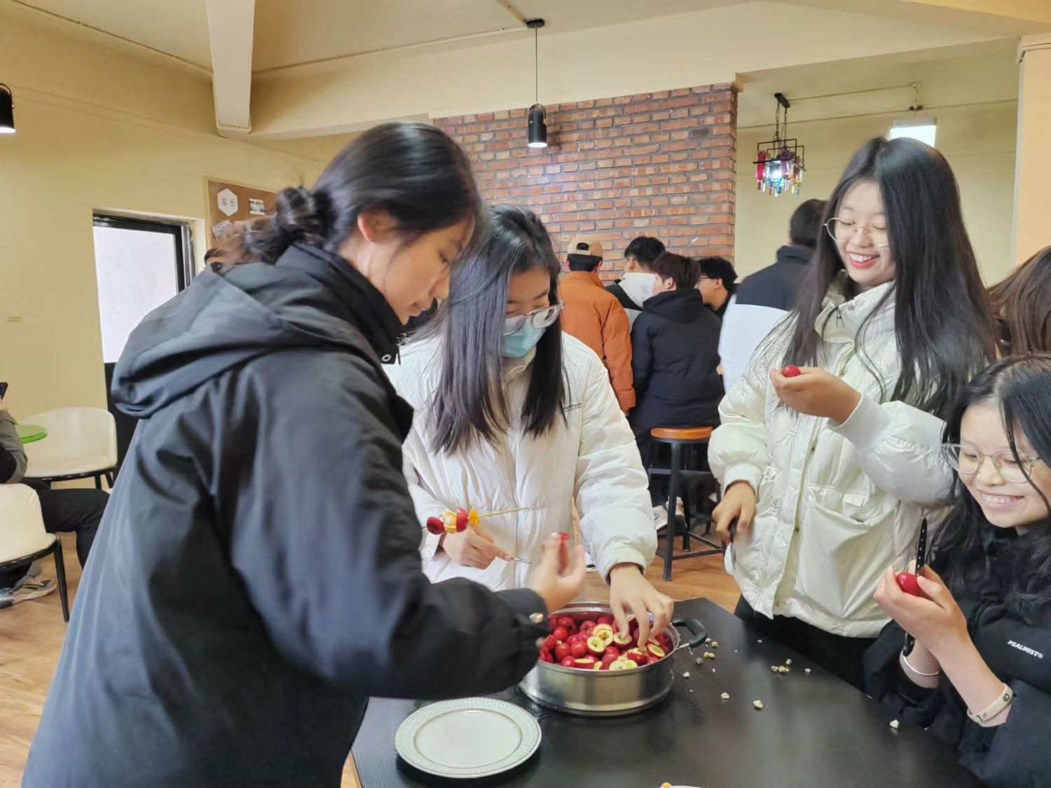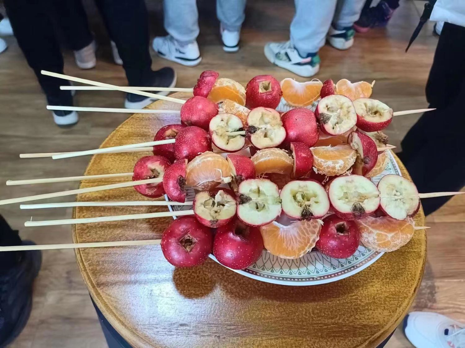 为了丰富同学们的课外生活,提高同学们的动手实践能力,大数据学院、信息工程学院网工2201班于12月15日15:00在太行健康时尚生活馆举行了以“梦回‘糖’朝,甜蜜初冬”为主题的完满团支部活动。活动伊始,组织委员把采购好的水果和冰糖放到桌子上,并讲解了糖葫芦的制作方法,随后,同学们迫不及待地把自己串成的水果串裹上糖浆,做属于自己的冰糖葫芦。经过不断地尝试,同学们终于掌握了其中的技巧,随着一个个美味的冰糖葫芦的出炉,大家脸上都洋溢着甜甜的笑容,成就感满满。这次活动不仅让同学们体验了自己动手的快乐,还品尝了美味的食物,让大家在活动中感受到了劳动的快乐和中国传统文化传承的魅力。初冬的一串酸甜可口而又美味的冰糖葫芦能勾起我们童年里最美好的回忆,那酸甜可口的味道给我们留下一抹最美的甜蜜,让我们享受到冰糖葫芦给我们带来的一份最幸福的场景,这就是冰糖葫芦的魅力所在。