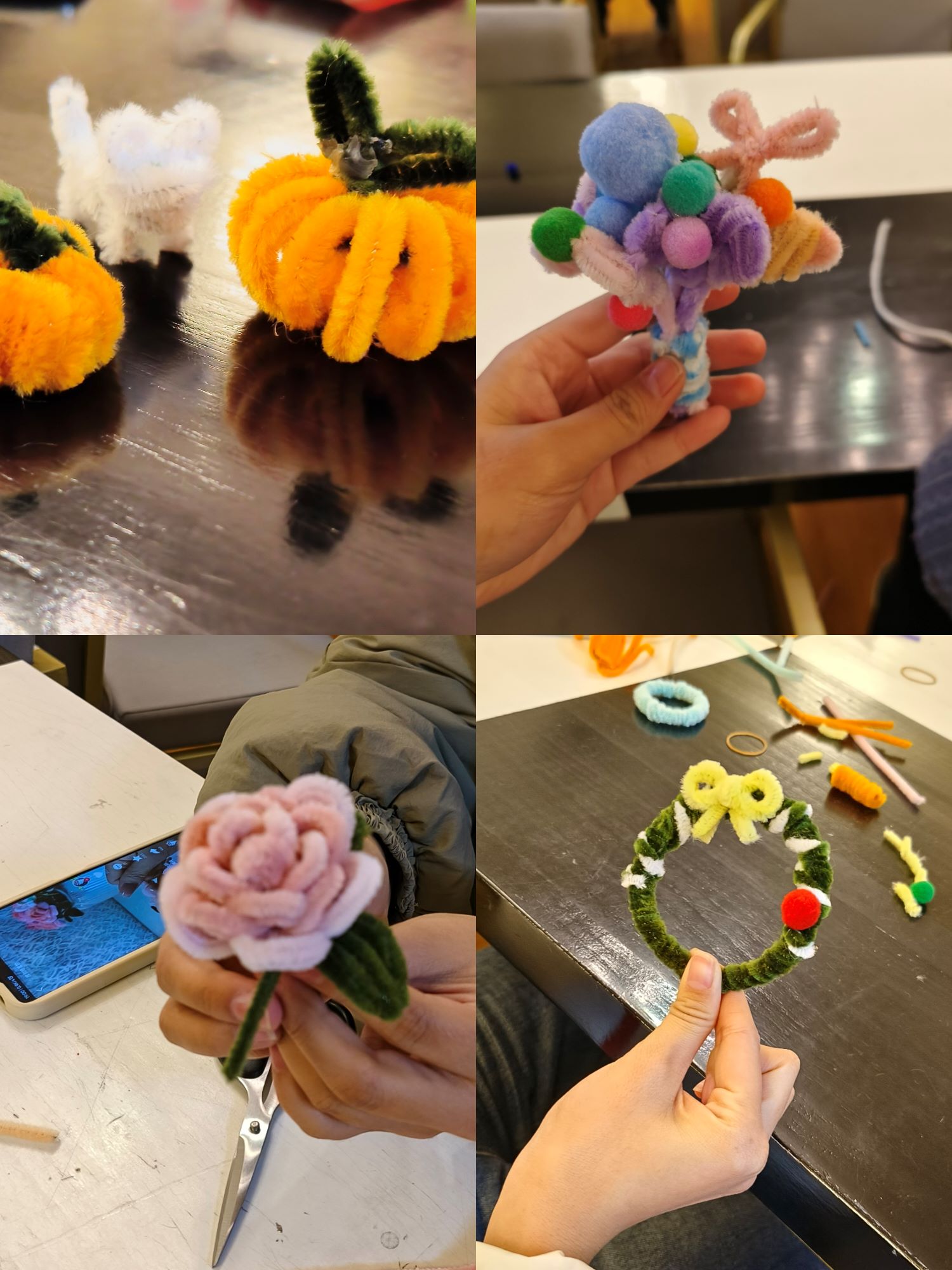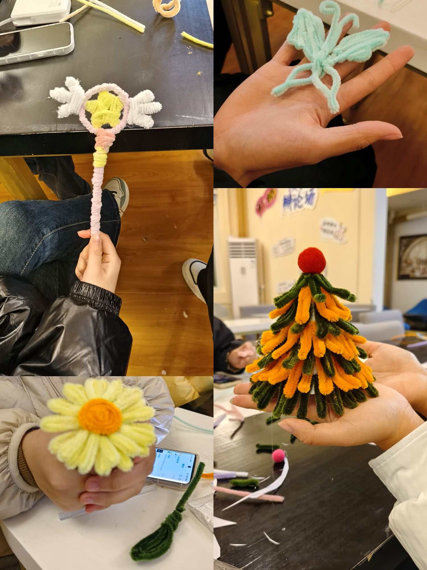 12月14日18:00,大数据学院、信息工程学院网安2301班在箕城书院共享大厅书院开展一场以“巧手造趣,润心有美”为主题的手工扭扭棒DIY活动。活动开始,由团支书马丹卿为同学们讲解制作步骤并分发扭扭棒和制作工具,自己动手DIY创作,同学们选择喜欢的扭扭棒,挥动自己的双手制作出令人满意的作品,例如四叶草、圣诞树、蝴蝶结等等。拿出一根扭扭棒,折大概一个半指节的长度,留一点距离在交叉处拧一圈,这样一个花瓣就做好了。同学们开动脑筋,充分发挥着自己的想象力和创造力,把发箍、发夹做得夸张且有趣,一件件别具匠心、富有童趣的创意作品在同学们灵巧的手中诞生。在这两个小时的时间,同学们积极地参与其中,坐在桌前拿起专业的工具,把自己想象成一位手工艺人,看着扭扭棒在自己的手中一点一点变成自己心中想要的成品的样子,那种喜悦感与成就感是无以比拟的。活动结束后大家纷纷将自己做出的成品展示出来,互相欣赏对方的作品,交流制作过程与感受,并且拍照留念。通过手工扭扭棒DIY活动,使同学们的动手能力得到提高,培养了同学们对手工的兴趣、爱好、增长知识、提高技能丰富学生的课余文化生活,为今后培养手工人才起着积极推动的作用。