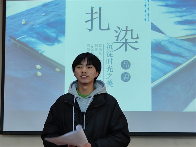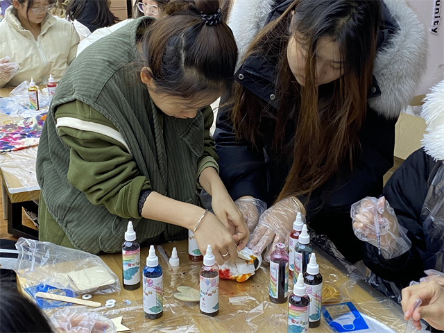 12月15日13:00,英语2204班于三达书院意空间开展了以“你好,扎染”为主题的完满团支部活动。此次活动以破冰行动来展开商务英语学院与艺术传媒学院的第一次联合活动,让同学们通过这样的活动形式,来加强人与人之间的交流以及对非遗文化的了解。这次活动特地邀请到了一位扎染老师为同学们讲解扎染的历史、技巧和制作过程。在了解到扎染的基本知识后,同学们也迫不及待地开始了扎染创作,他们将布料进行折叠、捆绑和染色,随意发挥,天马行空,创作出令人叹为观止的作品。在等候扎染作品晾干的过程中,班级还进行了“你画我猜”的游戏环节。每个小组的第一个人根据主持人提供的词汇在不发声的前提下对下一位同学比划答案,以此类推。这次扎染班级活动,同学们不仅学习了扎染的基本技巧,更重要的是体验了团队合作的乐趣,感受到了传统艺术的魅力。