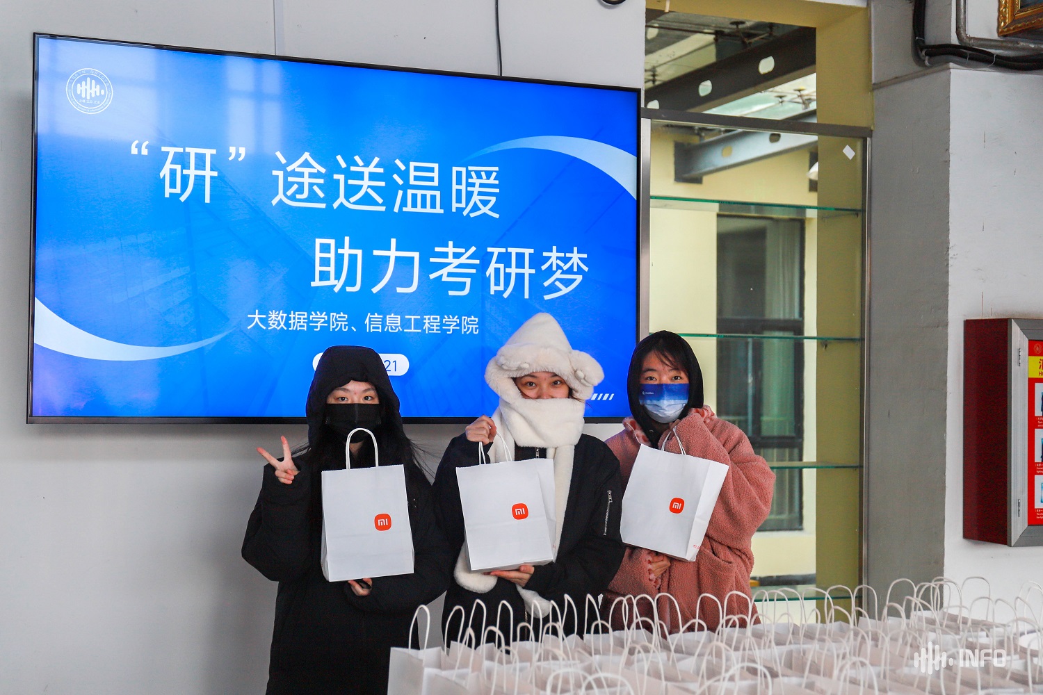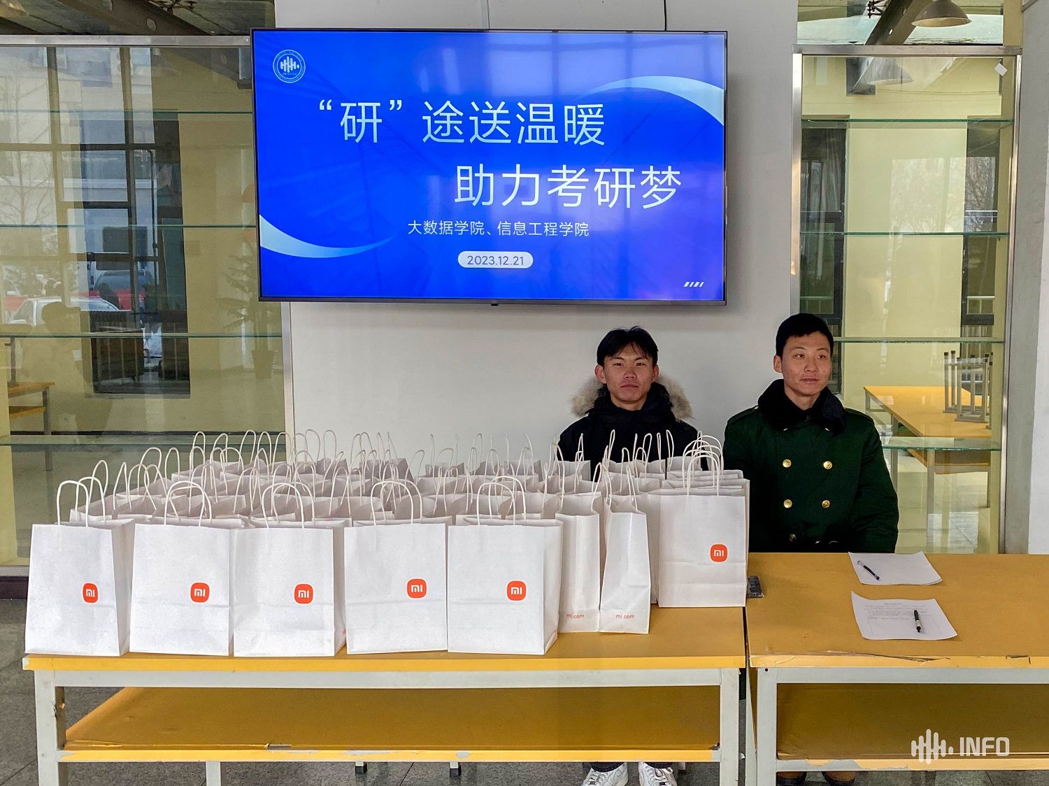 笔耕不辍,芳华待灼。伴随着2024届考研进入倒计时,为缓解备考压力,助力同学们冲刺最后一公里,坚定考研信念,积极迎考,12月21日16:00,大数据学院、信息工程学院网络工程志愿者于人工智能中心为考研学子发放暖心大礼包。