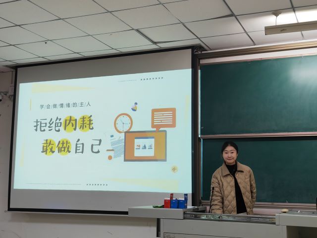 活动伊始,王雅欣老师首先为同学讲解了什么是“精神内耗”,它实际上是一种自我消耗,表现为自己否定自己,过分解读他人的言论,胡思乱想,将自己陷入一种悲观的情绪中,这种不好的情绪对个人的心理和身体都会造成一定的损害。紧接着,王雅欣老师提出了我们该如何面对生活中的精神内耗。首先,我们要辩证的看待事物。“精神内耗”究其原因是我们面临困难时所产生的一种消极情绪,认为自己做不好这件事情。但它也是一种积极情绪,有句话说的好“失败是成功之母”,只有遇到了困难,才会想要克服困难,不怕失败才会有前进的动力,才会向前。其次,我们应该保持一种心态——该做什么事时就做什么事,要适度地休息。我们要以一种积极的态度去面对生活中所遇到的事情,学会自我调节,不要让自身处于一个很累的状态中,毕竟只有在保持着饱满的精神时,我们才会更有干劲去完成工作任务。