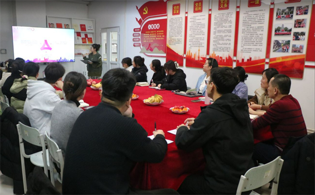 首先进行发言的是学院基层建设负责人张瑞芸老师,2023-2024年里,商务英语学院调研部以完满团支部和完满观察团工作为主思路,阐释如何致力于提高基层建设活力提升。
