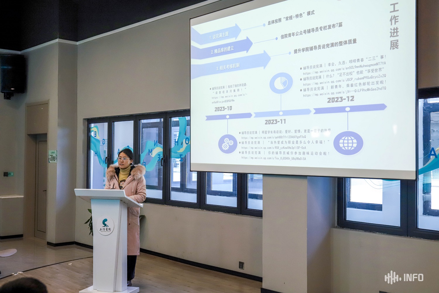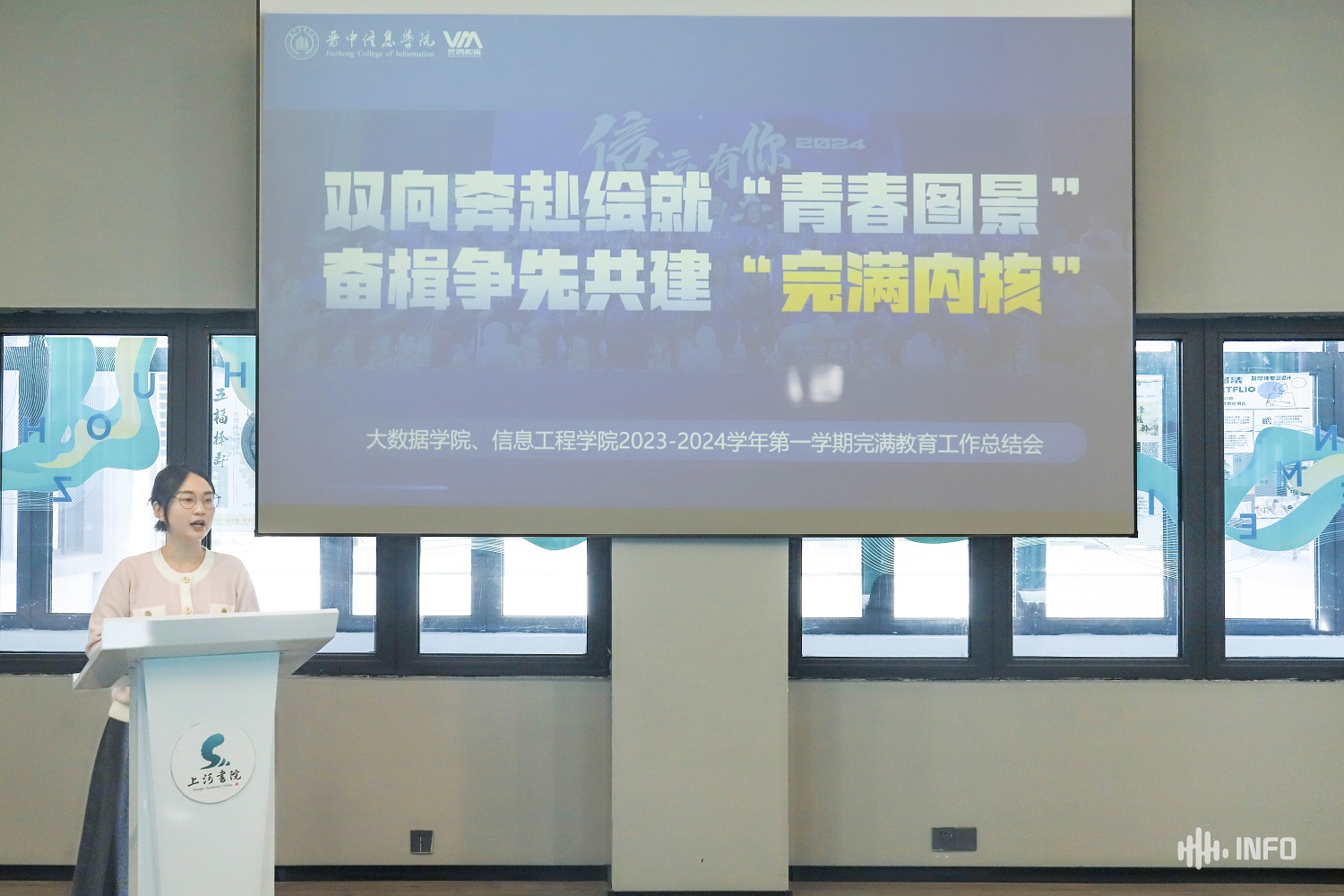 1月4日,大数据学院、信息工程学院于上河书院209圆心·青春社区剧场举行2023-2024学年第一学期完满教育工作总结会。学工副院长武海鹏、全体辅导员老师以及学生会主席参加会议,总结梳理过去一学期的完满教育主要工作,探讨共商未来的工作重点与发展规划。会议由团总支书记侯林莉主持。