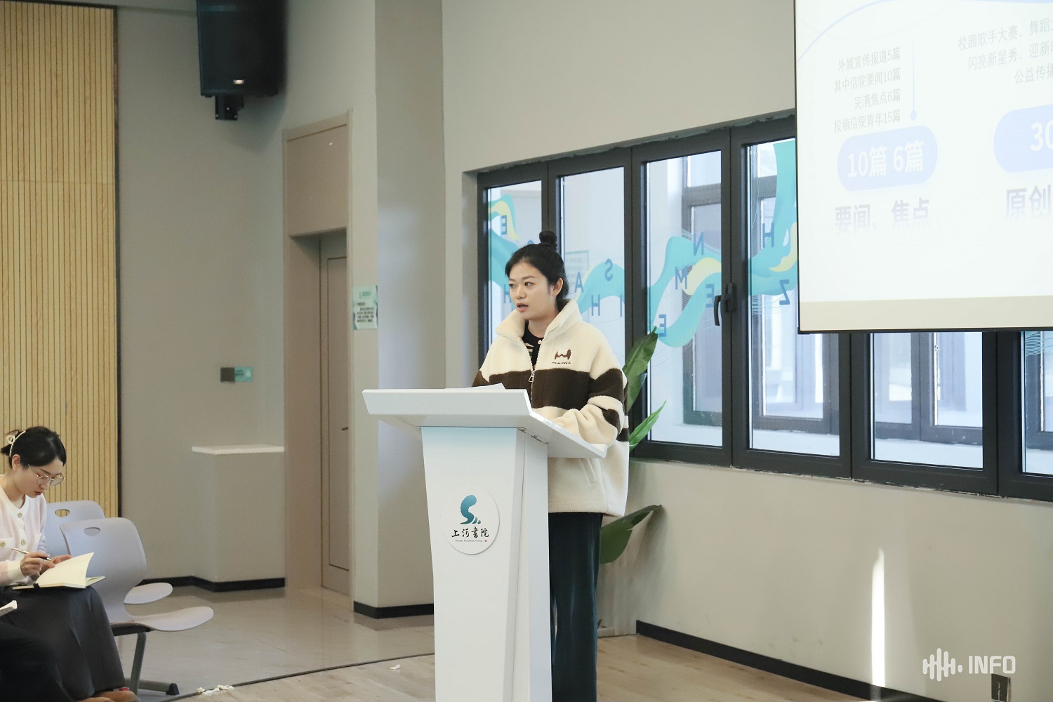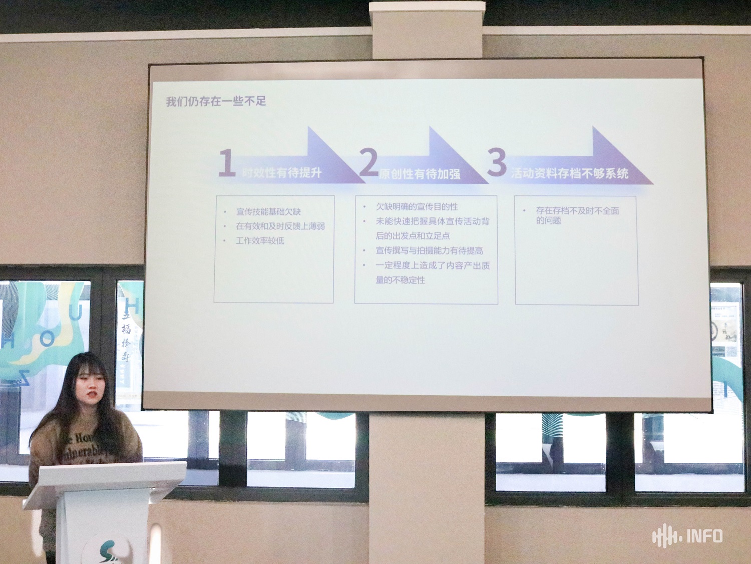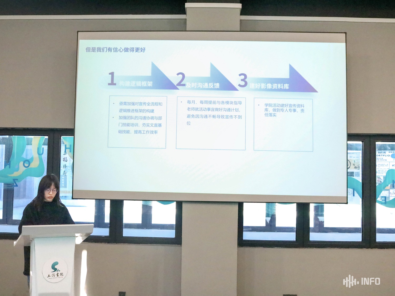 宣传指导老师闫相君表示,本学期工作致力于用宣传发声,用心用情,讲好信工故事,增设“数说完满”品牌阵地,拓展筑牢融合矩阵,呈现多维度数据,系统复盘完满活动。史欣超、郭文佳老师从宣传海报和视频的角度出发,指出当前学生干部缺乏必要的工作经验与业务技能的问题,还需提升组织内部运行效率。