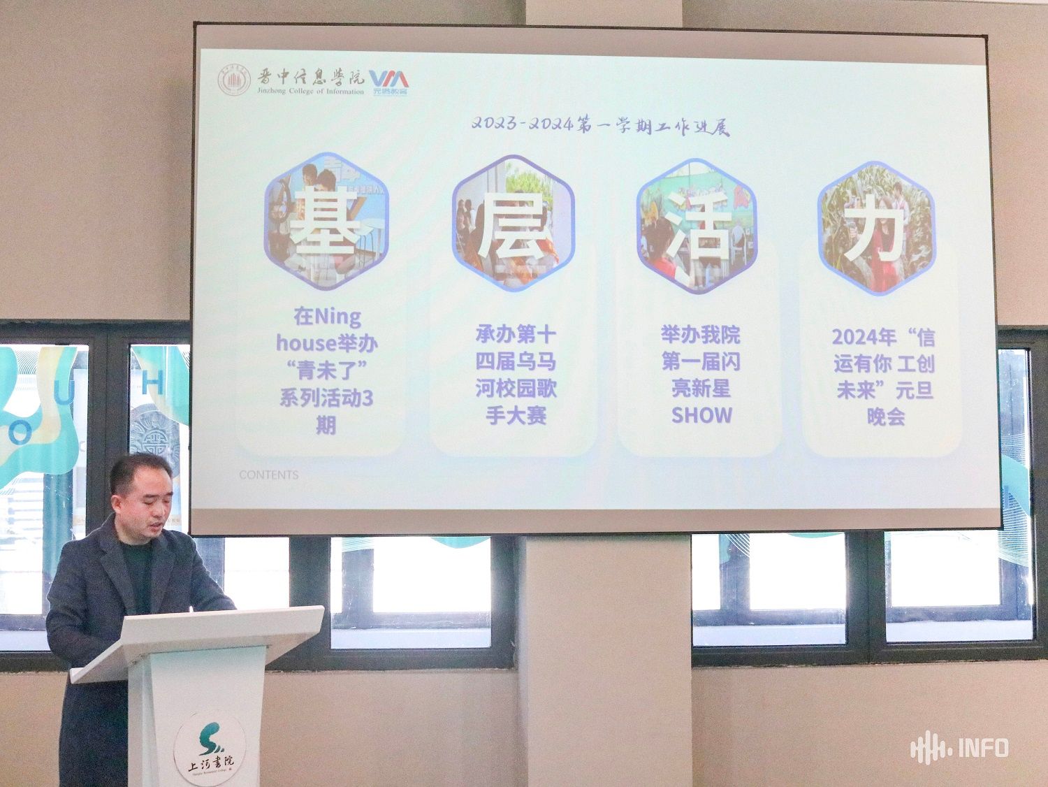 会议围绕奋力开拓学院完满教育工作极致发展之路,强调了“基层活力、赛事育人、信工故事、成果转化”四个关键词,各板块指导老师依次对本学期工作开展情况进行总结分析,并针对工作中遇到的问题和困难进行了深入探讨。