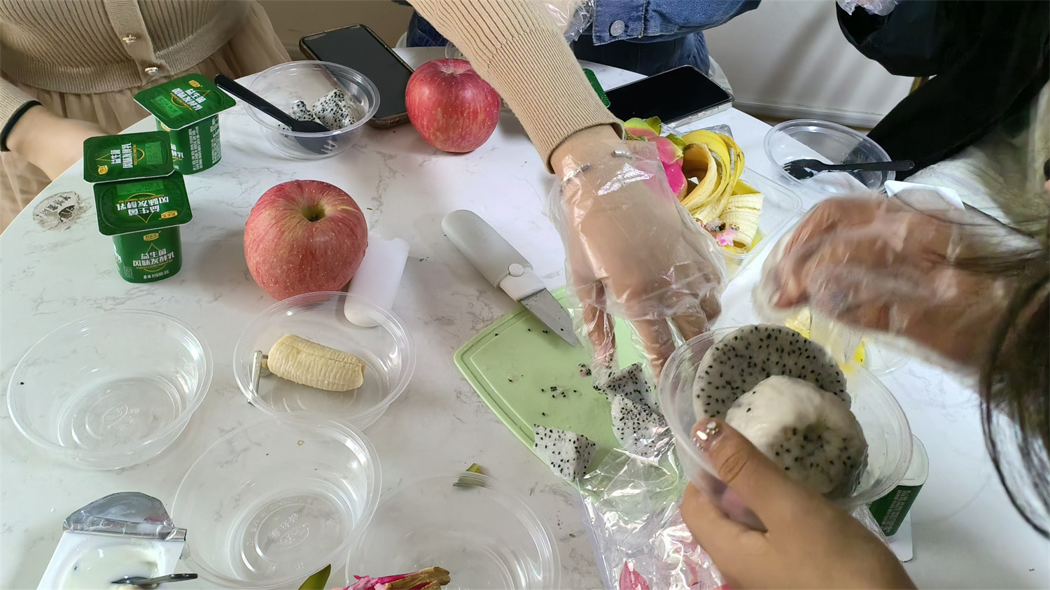 把春天的颜色搬进室内,品味一下五颜六色的水果。4月10日17:00,通信2301班在箕城书院思维拓展室开展了以“水果派对嗨起来”为主题的完满团支部活动。同学们根据自己的喜好,亲手制作了自己的水果捞。他们首先挑选了一个心仪的盒子,然后将新鲜的酸奶轻轻倒入碗中,酸奶清爽的味道在空气中弥漫开来。接着,同学们开始挑选自己喜爱的水果,有的选择了多汁的柚子,有的选择了清甜可口的香蕉,还有的选择了水分充足的哈密瓜。他们将水果一个个小心地洗净、切割成小块,然后轻轻地放入碗中,彩色的水果在白色的酸奶中显得格外美丽。在这个过程中,同学们不仅锻炼了手部的精细动作,还学会了如何搭配各种水果,创造出美味可口的水果捞。每一位同学都像是一位小厨师,精心调配着属于自己的水果捞,展现着创造力和想象力。