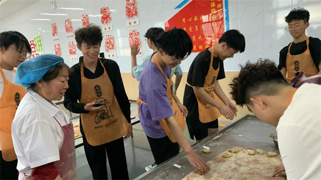 为了让同学们对太谷饼有更深入地认识,师傅对太谷饼的历史渊源、制作工艺和文化内涵进行了介绍。并在工作人员带领下同学们亲自动手体验制作太谷饼。从准备原料、搅拌面糊、烘烤成型,每一个环节都是那么新奇有趣。