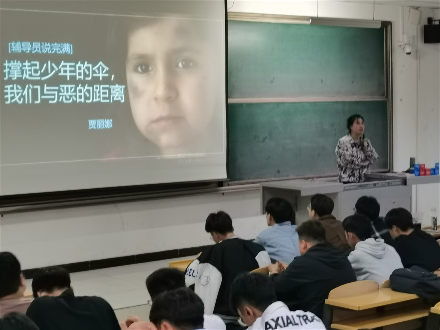 校园本应该是美好纯粹的,校园内我们可以放肆欢笑,为着一个共同的目标学习,简单而又友好地相互陪伴,成双成对在校园内闲逛,说着对未来的期待回忆着从前的往事。学校是安全温暖欢乐的,黑暗让人害怕抗拒的是“地狱”,或许我们是孤独的存在,却依然拥有着支持。校园霸凌,不应该存活在学校里,或许我们从未对别人进行过校园霸凌,但是,我们可能有时做了那个旁观者或者受害者。为了让同学们正确认识校园霸凌,学会抵抗校园霸凌,5月6日18:00,贾丽娜老师在2教201召开了以“抵制校园霸凌”为主题的辅导员说完满活动。