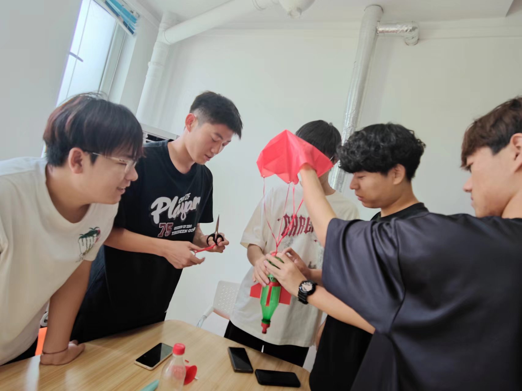 设计与优化,团队努力,智慧共勉,飞向未来,展翅飞翔,心中梦想远航。接下来,同学们5人一组自由组队,进行一场小游戏,游戏胜利的第一名会收获一个降落伞,第二名会获得除降落伞外的其他物品。在制作水火箭的轨迹上,同学们相互配合,携手前行,共同奋斗,困难转化为燃料。他们一起推动水火箭,坚信实践真理,踏向未知辽阔的太空,梦想飞扬,心中燃烧着热情的火焰。
