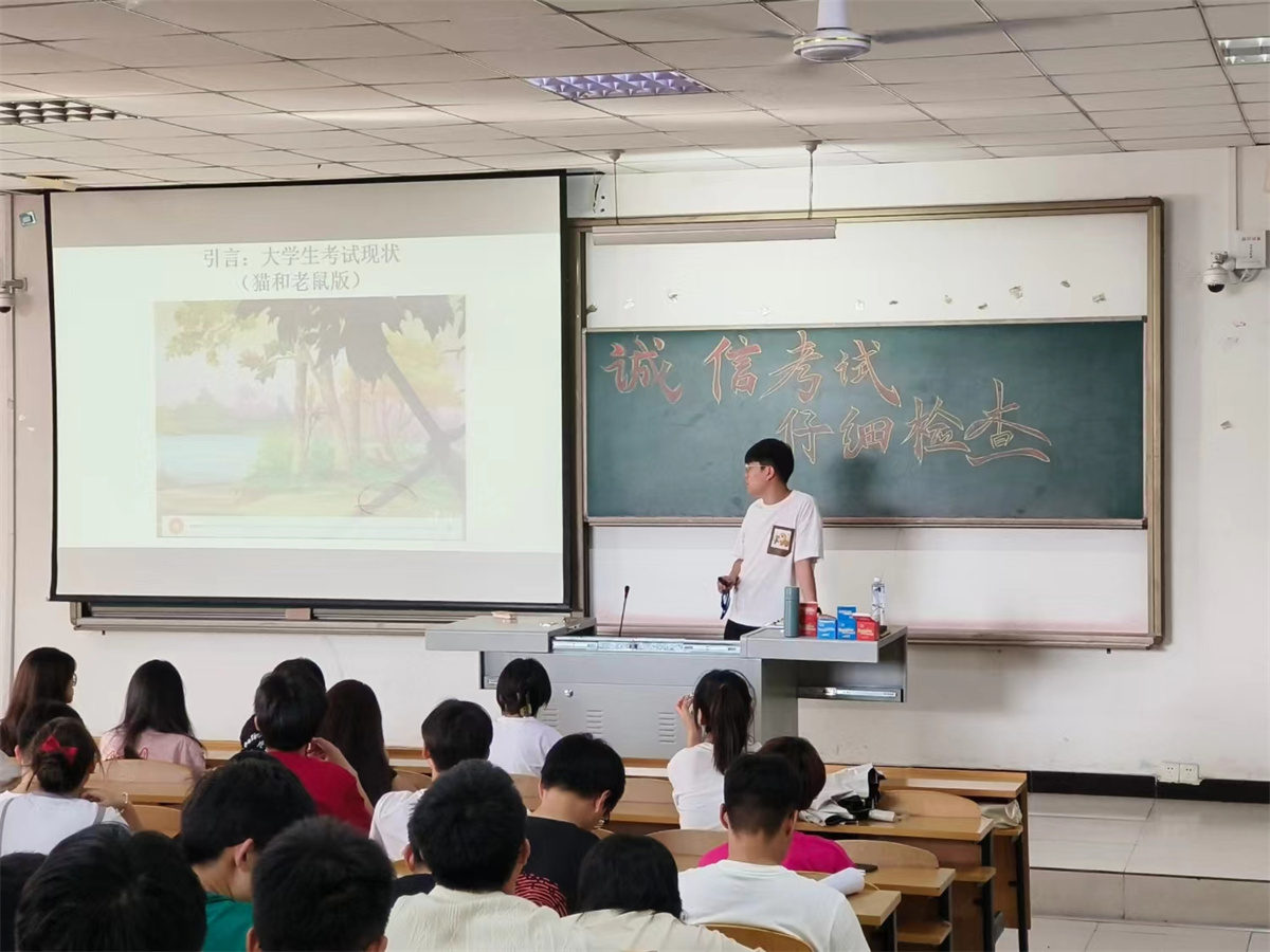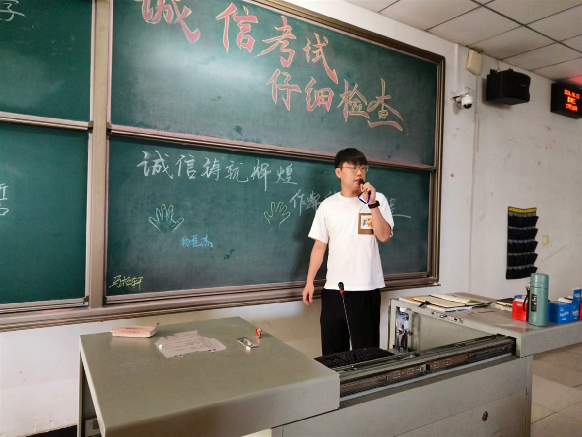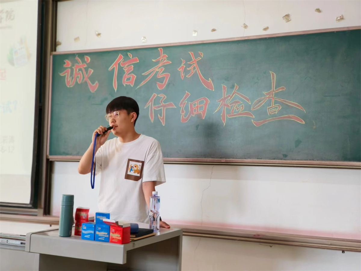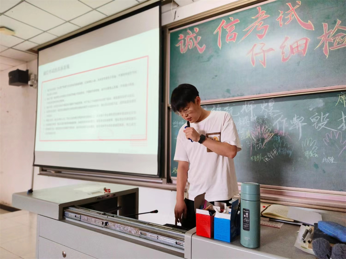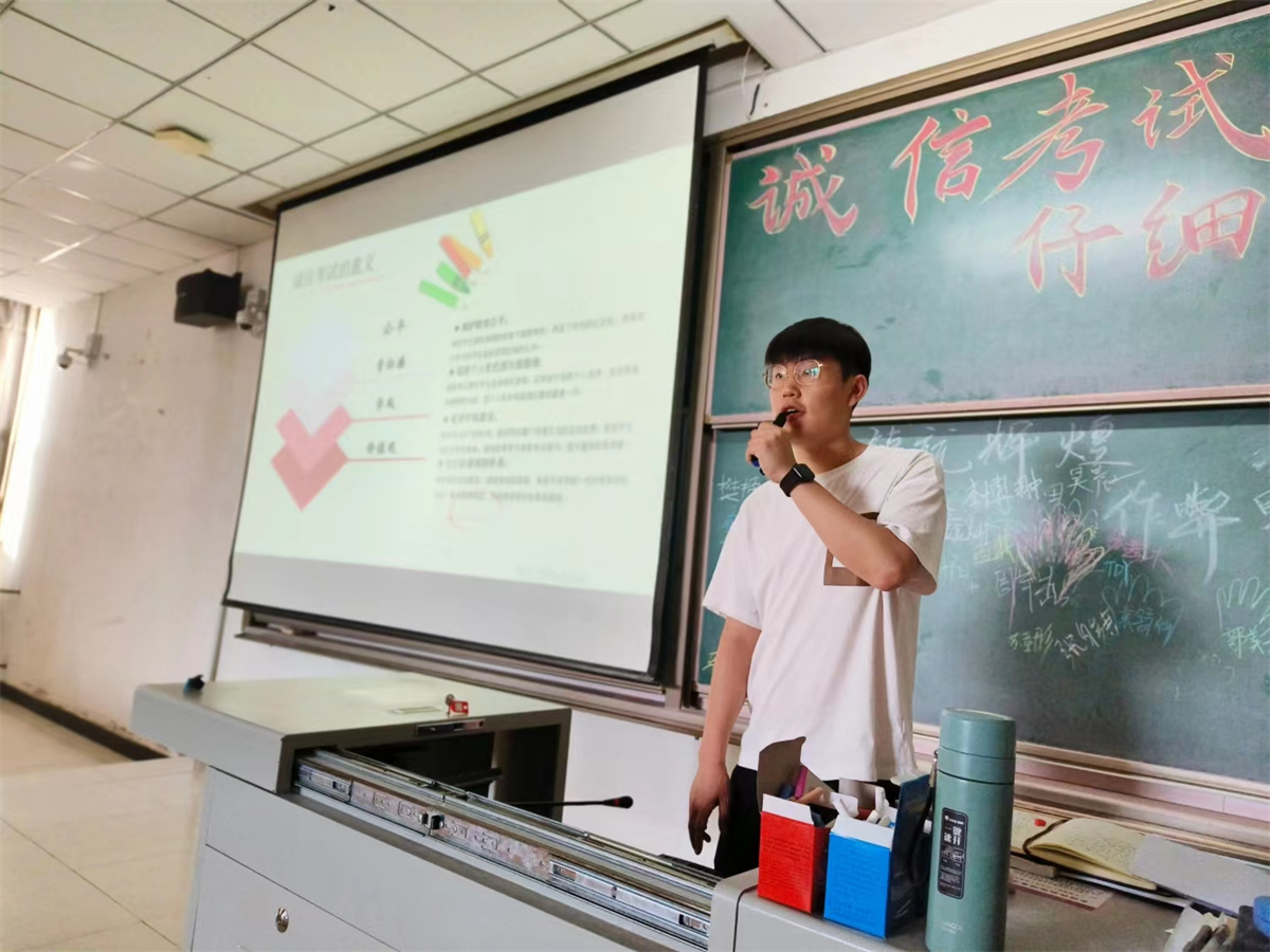 随着期末考试的临近,大学生们纷纷投入到紧张地复习中。为了加强学生的诚信意识,倡导诚实守信的考试风气,辅导员杜岩涛老师于6月12日17:00在二号教学楼201教室开展了一场以“纵有考试分秋色,需以诚信见英雄”为主题的辅导员说完满活动。