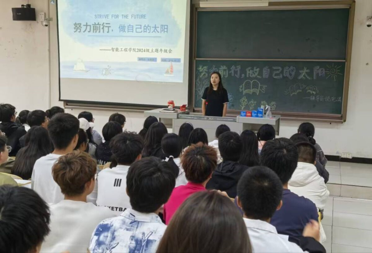 在充满活力且丰富多彩的大学校园里,太阳如同一盏明灯,照亮了学子们前行的道路。对于大学生们来说,太阳不仅仅是天空中的天体,更是一种象征,一种力量的源泉。它见证着同学们在知识的海洋中奋力遨游,在青春的舞台上绽放光彩。向阳而生,是我们应有的生活姿态,更是我们的信仰。我们每个人都应该找到属于自己的一缕阳光,如向日葵那样执着而坚定的向阳而生。今年刚步入大学生活的新生们,你们就是还没长大的“向日葵”,在新的校园,面对新同学、新老师、新舍友以及与以往高中截然不同的生活方式,你们打算如何让自己在接下来四年中茁壮成长呢?对此,为了让同学们在大学时光中努力前行,绽放属于自己的光芒,2024级辅导员老师张敬美于9月27日15:00在二教201教室,开展了主题年级会,为大家讲述了接下来的大学生活如何努力前行,做自己的太阳,用自己的光芒照亮前行的道路。
