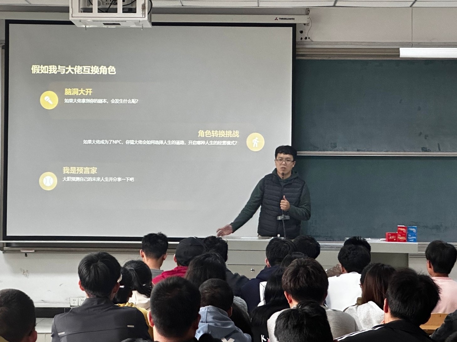 杨鸿鹏老师通过一个小游戏:假如我与大佬互换角色,让同学们大胆想象,如果大佬拿到“你”的剧本,会发生什么呢?如果大佬成为NPC,大佬会如何选择人生道路,开启哪种人生的经营模式呢?如果“你”成为大佬,你未来的人生将会被如何书写呢?同学们在畅所欲言的同时,拓宽了自己视角,也与其他同学交换了思考。大家纷纷表示:“这个游戏不仅激发我去思考了关于未来我从来没想过的一些东西,还让我明白了,大佬们的成功之路并不都是一帆风顺的,都是在挫折中不断跌倒再爬起的,在未来的奋斗路上我们也要不坠青云之志!”