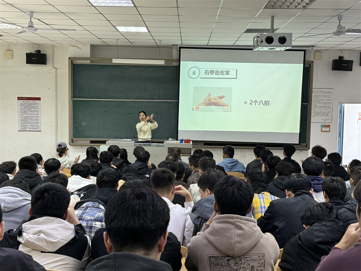 活动伊始,段老师带领同学们完成了简单却充满魔力的“十巧手指操”,如虎口平击、手掌侧击、手腕互击等。伴随着欢快悦耳的音乐节奏,同学们敲击着手掌。手指灵活地弯曲与伸展间,唤醒了同学们的参与热情,也为本次活动奠定了轻松愉快的基调。