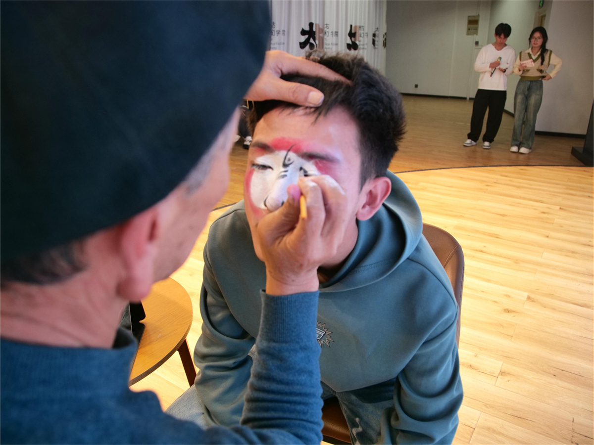 同学们被孙老师的表演深深吸引,纷纷表示想要亲自尝试太谷秧歌。于是,应众学生之邀,孙老师随即走上前台,手持化妆工具,开始了独特的舞台妆造示范。尤其当他为同学绘制丑角妆容时,那诙谐夸张的手法立刻引发了一阵又一阵的欢笑声,现场氛围顿时轻松愉快。在他的引导下,同学们逐一学习了基本的唱腔与台步,尽管初学乍练略显笨拙,但那份认真与专注却显得格外动人,这一刻,舞台上不再是高不可攀的艺术表现,而是每个人都能触及的文化体验。