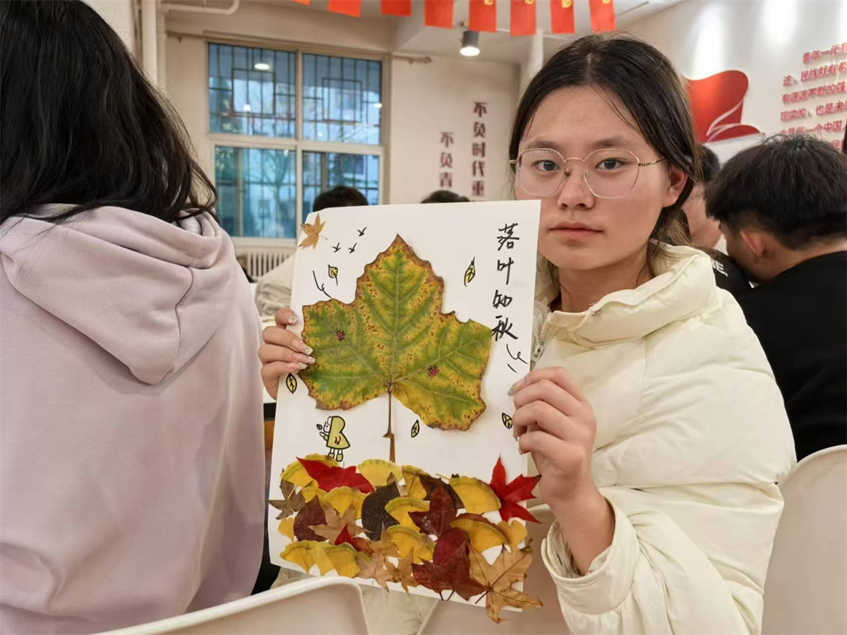电气2404班于11月13日16:00,在青藤书院会议室举办了一场“拾叶绘秋韵,笔下绘秋情”完满团支部活动。此次活动旨在引领大学生们在紧张的学业之余,亲近自然之美,为同学们搭建起一个展示艺术才华的璀璨舞台。收集完充足的落叶后,同学们携带着自己的“秋日宝藏”来到了青藤会议室,大家铺开画纸,拿起画笔,开始在画纸上施展自己的创意,勾勒出一幅幅栩栩如生的秋日景致。有的同学将叶子拼凑成活灵活现的小动物,俏皮的姿态仿佛赋予了叶子生命;有的则以叶子为装饰,秋天的美景跃然纸上;还有的用细腻的笔触写下了与秋天有关的诗句,让叶子都洋溢着诗意,每一笔每一划都流露出同学们对秋天的深情厚意。通过此次活动,同学们不仅发现了秋天独有的美丽,更激发了他们对生活的无限热爱和对艺术的深切追求。在这个金黄色的秋季,大家以落叶为素材,以画笔为媒介,共同编织了一段属于自己的秋情故事,为青春岁月留下了一抹难忘且珍贵的记忆。