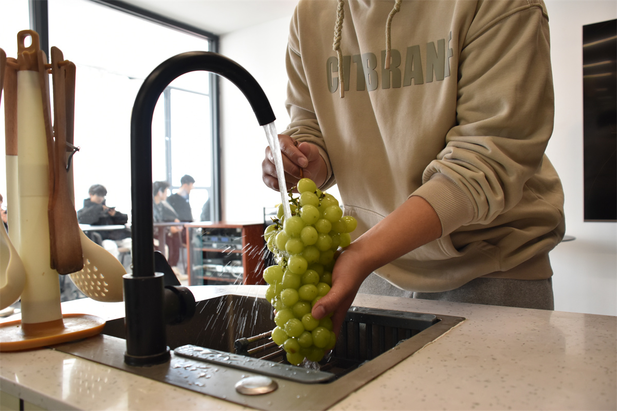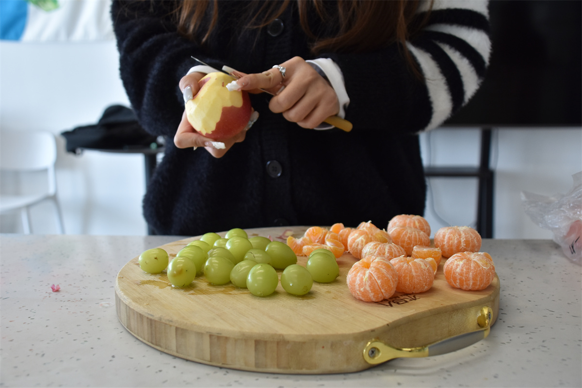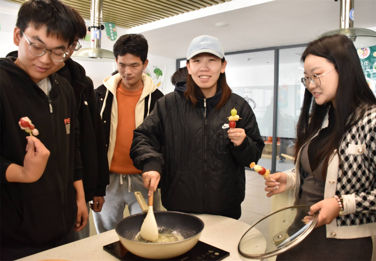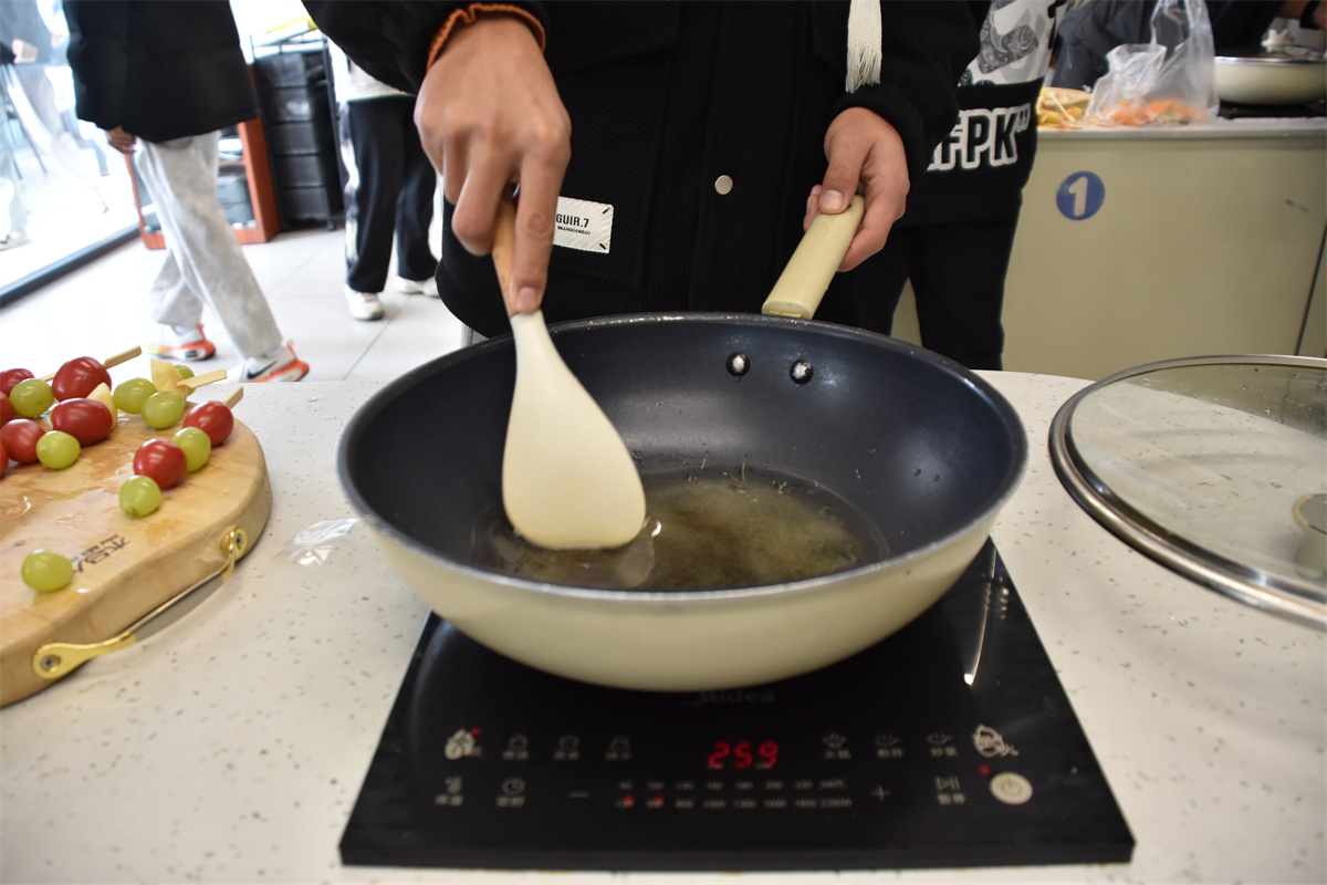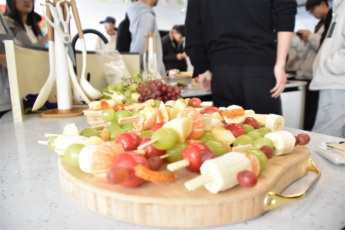 活动当天,同学们以宿舍为单位分为几个小组。在赵乐老师和任文姣老师的指导下,开始做冰糖葫芦。制作过程分为洗、串、熬、蘸和冷却几个环节。最关键的是熬糖环节。锅中的冰糖慢慢融化,变成了金黄色的糖浆,散发出诱人的甜香。当糖浆达到合适的火候,同学们小心翼翼地将串好的水果放入锅中,迅速转动,让每一颗水果都均匀地裹上一层薄薄的糖衣。在糖浆冷却的瞬间,糖葫芦变得晶莹剔透,晶莹的糖衣包裹着各种形状的水果串,宛如水果穿上了一件璀璨的琉璃衣,散发着迷人的魅力。在制作过程中,任文姣老师和赵乐老师不时地穿梭在学生之间,耐心解答疑惑,纠正操作错误。学生们也相互帮助,分享着制作经验和成果,整个厨房充满了欢声笑语。
