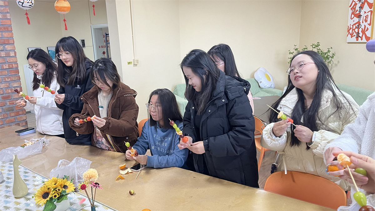 为促进同学们之间的交流合作,培养同学们的动手能力和创新精神。11月21日10:30,校团委志愿服务中心主任赵乐老师与智能工程学院辅导员任文姣老师联合机电2402班在毣谷望野•共享厨房以冰糖葫芦这一中国传统小吃为主体,展开了一场温暖与甜蜜交织的以“智工书梦青春志,砺耘岁月香自至”为主题的完满团支部活动。制作过程分为洗、串、熬、蘸和冷却几个环节,锅中的冰糖慢慢融化,变成了金黄色的糖浆,再将串好的水果放入锅中,迅速转动,让每一颗水果都均匀地裹上一层薄薄的糖衣,在糖浆冷却的瞬间,糖葫芦变得晶莹剔透,晶莹的糖衣包裹着各种形状的水果串。同学们早已迫不及待,咬上一口,酸酸甜甜的味道在口中散开。此次完满团支部活动不仅是一次舌尖的非遗,更是一次心灵的洗礼,同时也增进了师生之间的感情交流与互动合作。这个冬天,定然温暖且甜蜜。