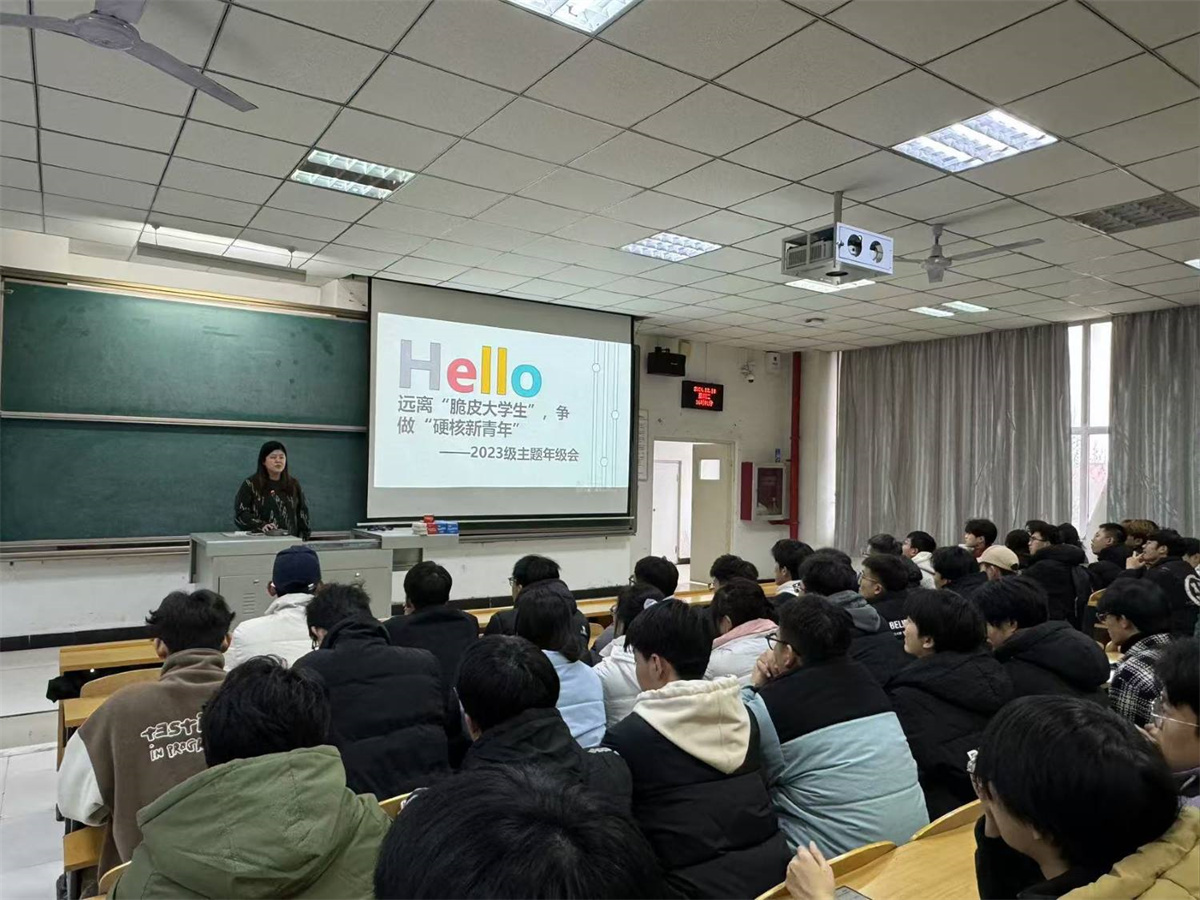 争做硬核新青年,用行动诠释青春。当代中国青年,恰逢其时,责任重大。“脆弱之躯”难以承载历史重托,担当作为呼唤“坚韧”力量。郑老师给同学们提出以下建议:一是要树立远大理想,明确人生目标和追求;二是要勇于担当家庭、社会和国家责任,为社会做出贡献;三是要不断提高自己的综合素质和能力水平。郑老师希望同学们拒绝“脆皮”,以强健体魄搏击风雨,以豁达的心态踏破荆棘,承担起时代赋予我们的责任和使命,做“硬核”大学生!