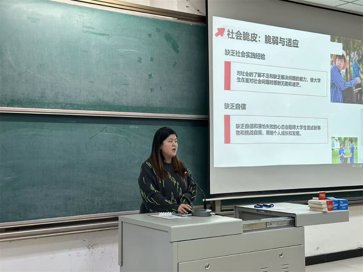 在这个信息爆炸、价值多元的时代,“脆皮大学生”这一网络热词悄然走红,它不仅成为了一种自嘲,更是对当下部分大学生群体特征的一种生动而深刻的描绘。这些“脆皮大学生”往往被形容为在面对学业压力、就业竞争以及复杂人际关系时显得较为脆弱,如同“脆皮”一般容易受损。“脆皮”戏谑的背后,藏着的是对身心强健的双重呼唤。为了增强同学们的健康意识,帮助学生缓解学习压力,增强心理韧性,促进身心健康发展,智能工程学院2023级辅导员郑琦老师于12月10日16:00在2教304开展了一次以“远离‘脆皮’大学生,争做‘硬核’新青年”为主题的辅导员说完满活动,正式启动“脆皮拯救计划”。