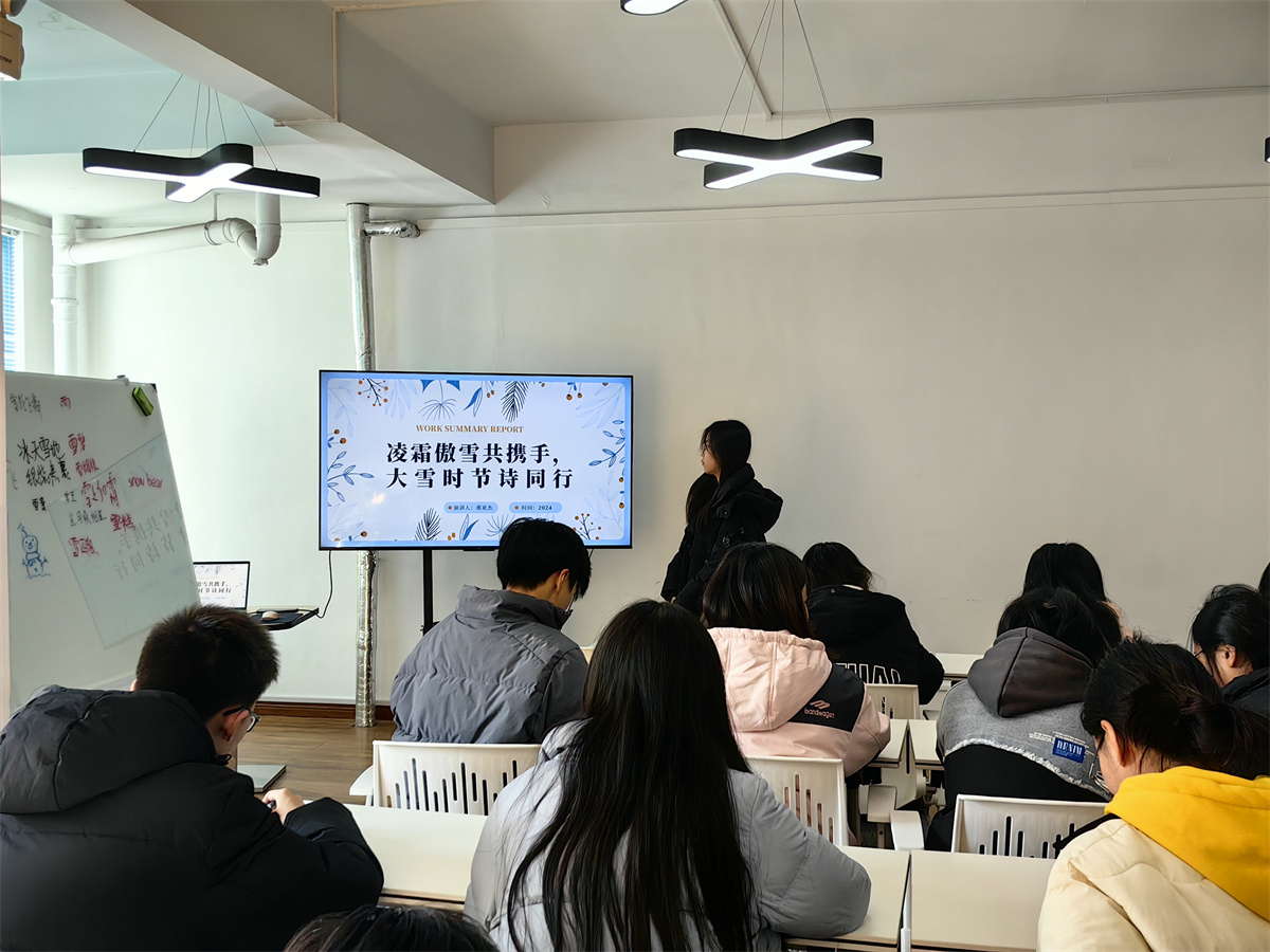 12月7日14:30,通信2302班紧扣大雪节气,成功举办了一场别开生面、富有文化韵味的以“凌霜傲雪共携手,大雪时节诗同行”主题的完满团支部活动。活动伊始,学生代表以一句诗词开场,学生们循着先辈足迹,以诗会友。诗词知识抢答环节率先点燃气氛。紧接着的诗词接龙,则更考验团队协作与临场反应。以“雪”字起头,各小组依次接诗,从“雪消门外千山绿”到“雪暗凋旗画”,思维碰撞、灵感迸发。此次活动,不仅是一场诗词盛宴,更是班级在传统节气下,厚植文化自信、增进同学默契的生动实践。