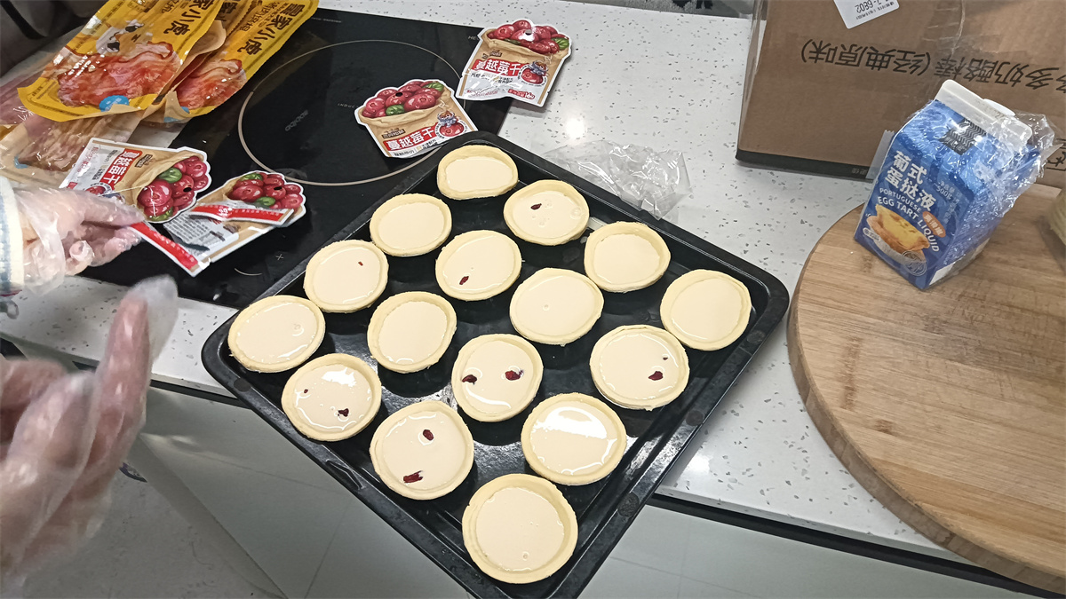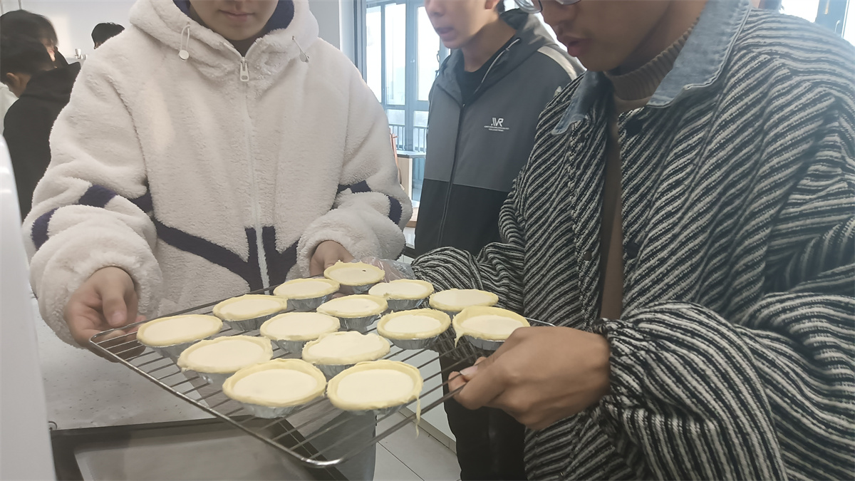 机电2301班于12月9日16:00在毣谷书院毣谷望野共享厨房举办了以“寒日暖灶,梦绘绮宴”为主题的完满团支部活动。活动伊始,房间被精心布置成了一个美食工坊。同学们围坐在摆放整齐的桌椅前,桌上摆满了制作蛋挞和披萨所需的丰富食材,有新鲜的水果、香浓的芝士、美味的火腿以及各种酱料,让人垂涎欲滴。在活动宣布开始后,同学们纷纷卷起袖子,跃跃欲试,开启了这场美食制作之旅。经过近一个小时的努力,随着烤箱的开启,整个房间弥漫着蛋挞和披萨逐渐烤熟的诱人香气。同学们一边兴奋地交流着制作过程中的心得体会,一边满心期待着自己的作品新鲜出炉。此次制作蛋挞、披萨的班级活动不仅让同学们在紧张的学习之余放松了身心,还锻炼了大家的动手实践能力和团队协作精神。