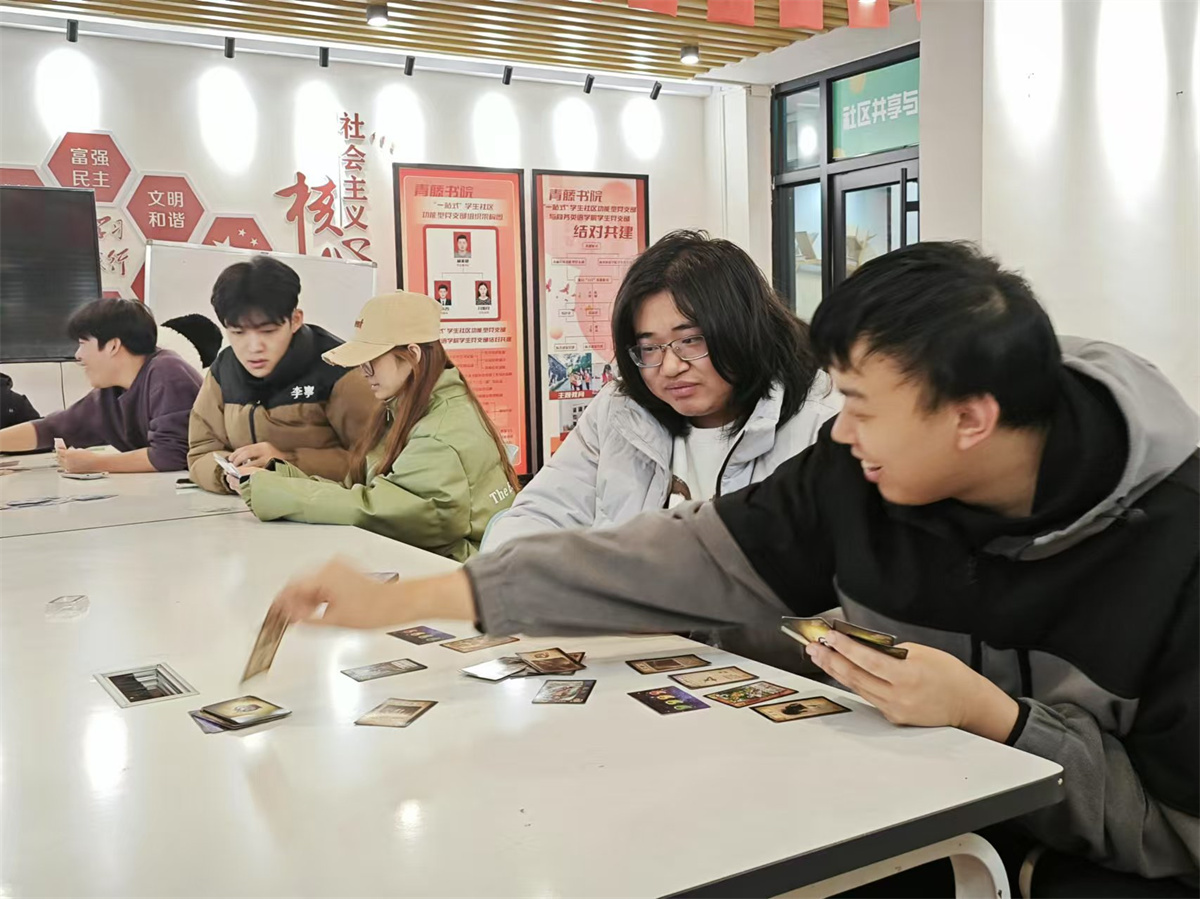 人工智能2302班于12月11日14:00在青藤会议室举办了以“智弈星河·慧战云海”为主题的完满团支部活动。活动伊始,向同学们介绍中国棋牌文化的发展史,从先秦到明清,随之点出本次活动的主要部分——三国杀。在简单介绍游戏规则后,同学们便将自己代入到卡牌角色中,想象自己在三国时期据守一方,指挥上万人作战。通过棋牌这种益智类游戏,打破传统,激发同学们的思维活力,提升他们的决策能力和团队协作精神。