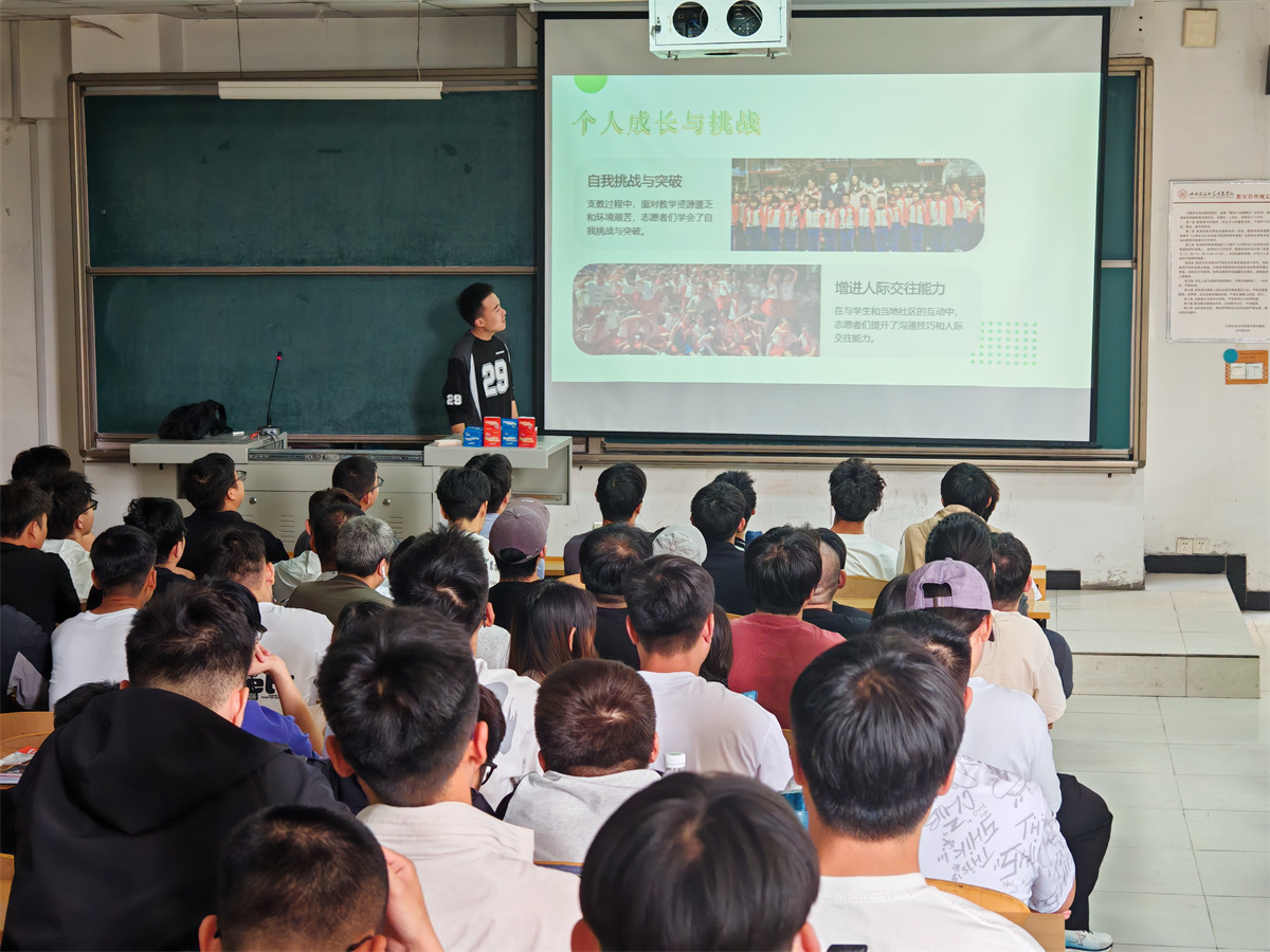 董老师从“支教的动机”出发,深情讲述了投身教育公益的初心——既是对志愿精神的传承,也是对社会责任感的践行。他提到,支教是一场“双向奔赴的成长”:志愿者将知识与关怀带到教育资源薄弱的地区,为孩子们打开认知世界的窗口;而孩子们对知识的渴望,也时刻提醒着志愿者教育的温度与重量。“当我们选择踏上支教之路,便是选择了用行动回应‘教育公平’的呼唤。”