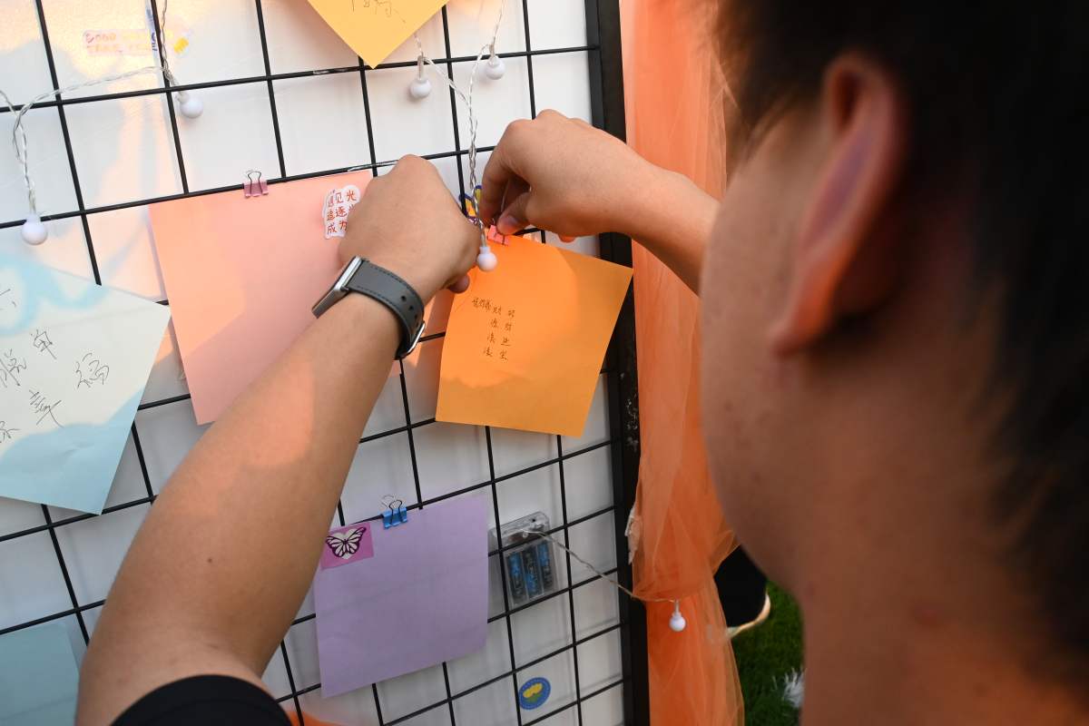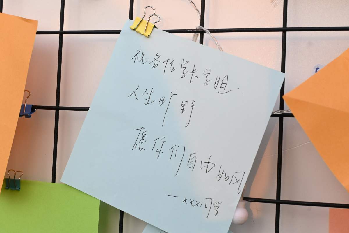 一张张写满祝福的纸条被小心翼翼地贴在拾光架子上,这些五颜六色的祝福,不仅是对未来的美好期盼,更是同学们青春岁月的珍贵见证。大家围在拾光架子前,相互分享着自己的祝福,脸上洋溢着幸福的笑容。