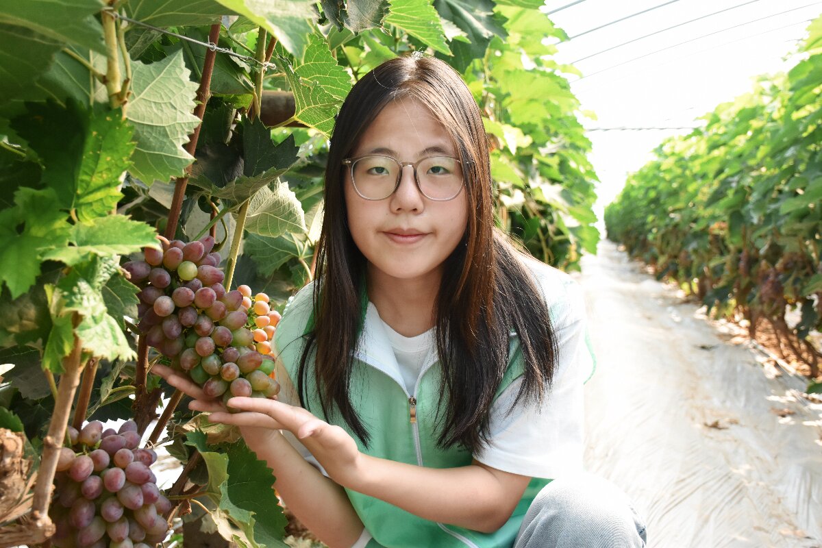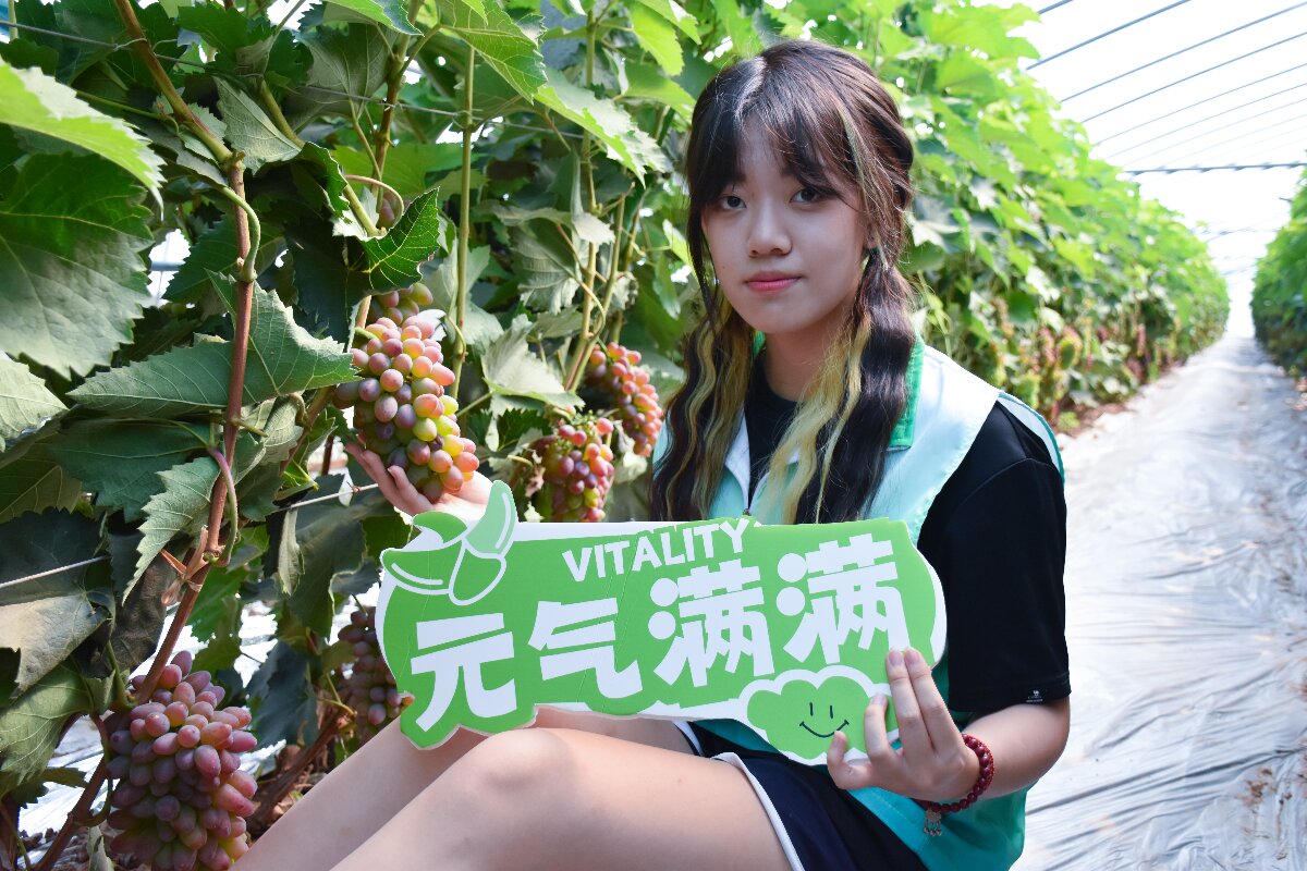 随后,团队员韩蕊璐化身“科普讲师”,以生动且严谨的语言,将水果知识与健康理念娓娓道来。晶莹剔透的果串垂挂架下,紫黑饱满的巨茉莉葡萄如玛瑙般缀满枝头,富含的花青素具有出色的抗氧化性;散发着馥郁玫瑰香气的阳光玫瑰,果肉脆嫩多汁,其维生素C含量是苹果的数倍;被誉为“百果王”的冬枣,表皮泛着诱人红晕,轻咬一口清甜汁水四溢,富含的维生素P能增强毛细血管弹性;还有藤蔓间即将成熟的百香果,黄绿交织的表皮下,蕴藏着多种维生素与膳食纤维,集美容养颜、促进消化等功效于一身。从萌芽破土的生命初始,到繁花盛放的授粉过程,再到果实成熟的营养沉淀,系统性讲解这些水果从种植到收获的全过程。不仅让观众直观领略植物生长的奇妙,更通过营养成分分析,将“以果养生”的健康理念传递给大众。