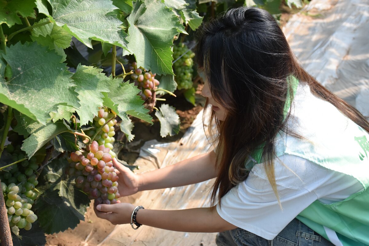 在生机蓬勃的生态基地,团队借助专业直播设备,通过多机位切换与微距镜头特写,为观众全方位呈现从土壤改良、植株培育到果实采收的全链条健康奥秘。镜头前,主持人李亚馨捏起一串成熟的葡萄,展示果蒂处紧实干燥的褶皱特征,“成熟葡萄果蒂自然收缩变干,与果柄紧密贴合,这是糖分充分积累、营养吸收到位的重要象征。”此番讲解帮助观众掌握了判断葡萄成熟度的方法,提升了对农产品的认知。