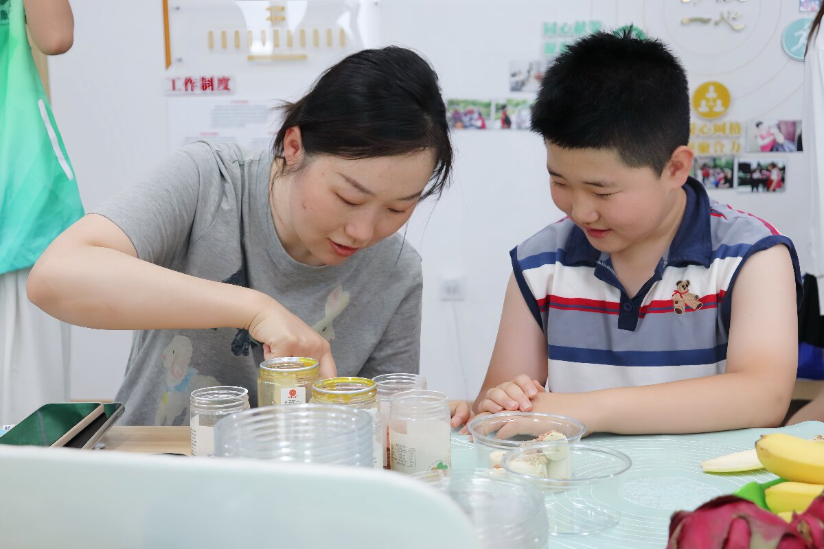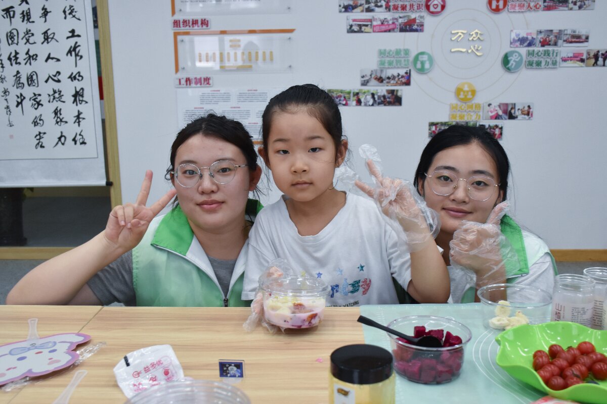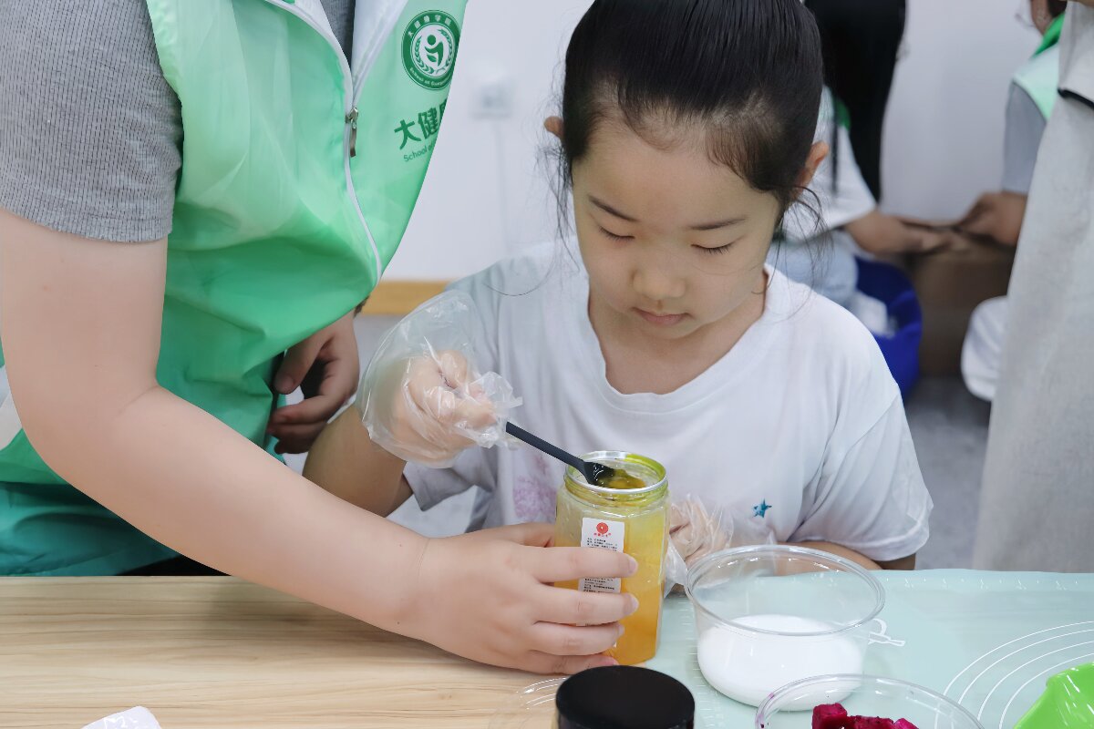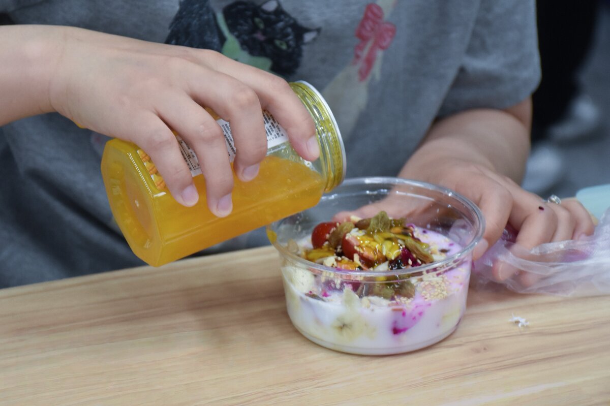 同时,针对社区居民日常饮食中蛋白质和膳食纤维摄入不足的问题,队员们系统科普了蛋白质、维生素等营养素对人体的重要作用,现场示范制作酸奶碗并讲解食材搭配原理。居民们亲手操作,为孩子打造出色彩丰富的“童趣酸奶碗”,在轻松互动中掌握了实用的营养搭配技巧。
