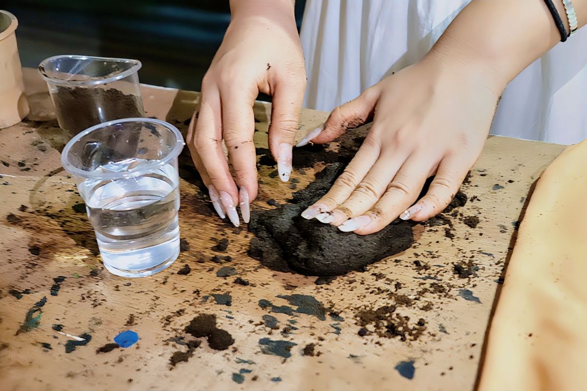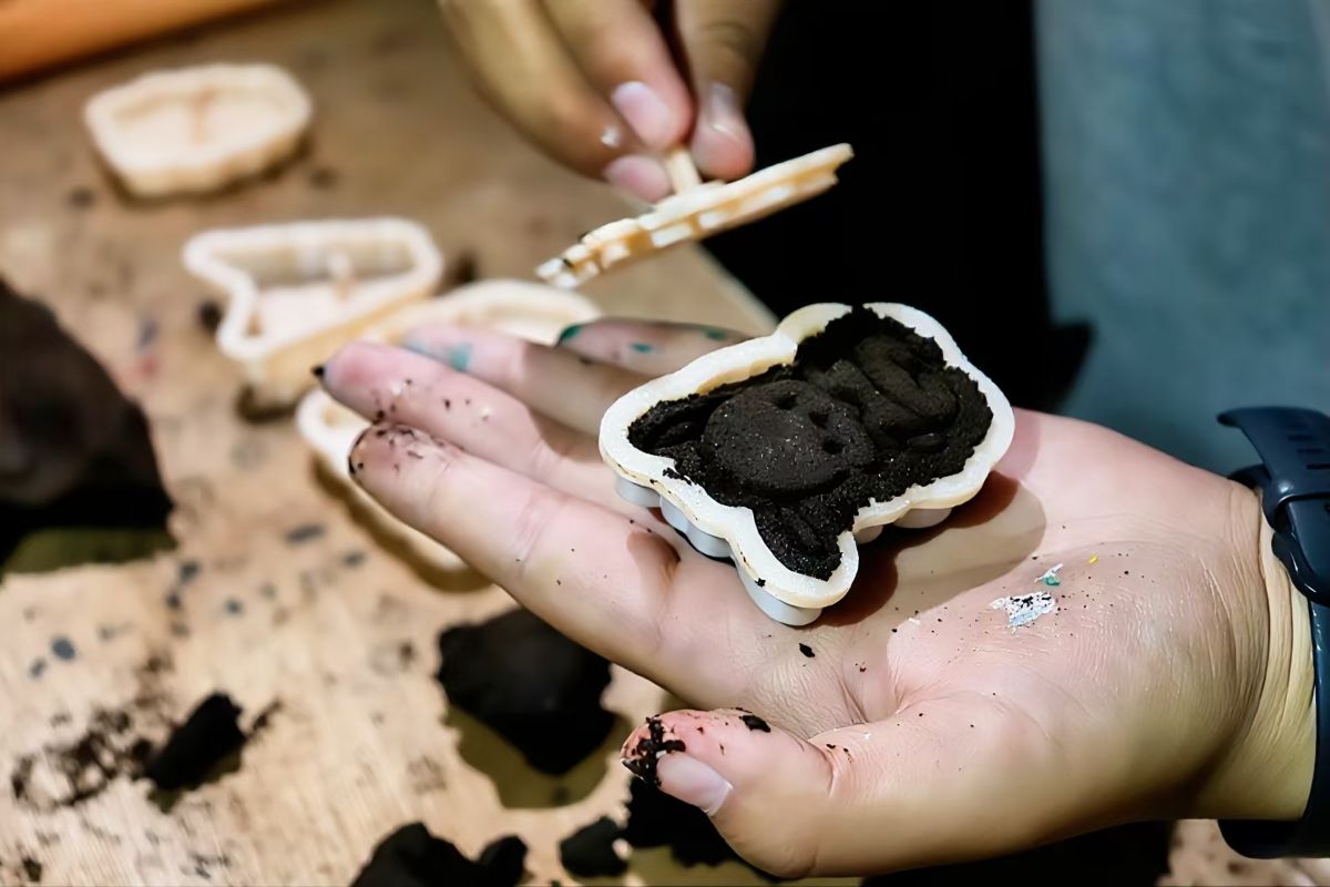香牌制作区将咖啡渣与楠木粘粉混合成型,干燥后制成兼具香气与观赏性的生活用品。