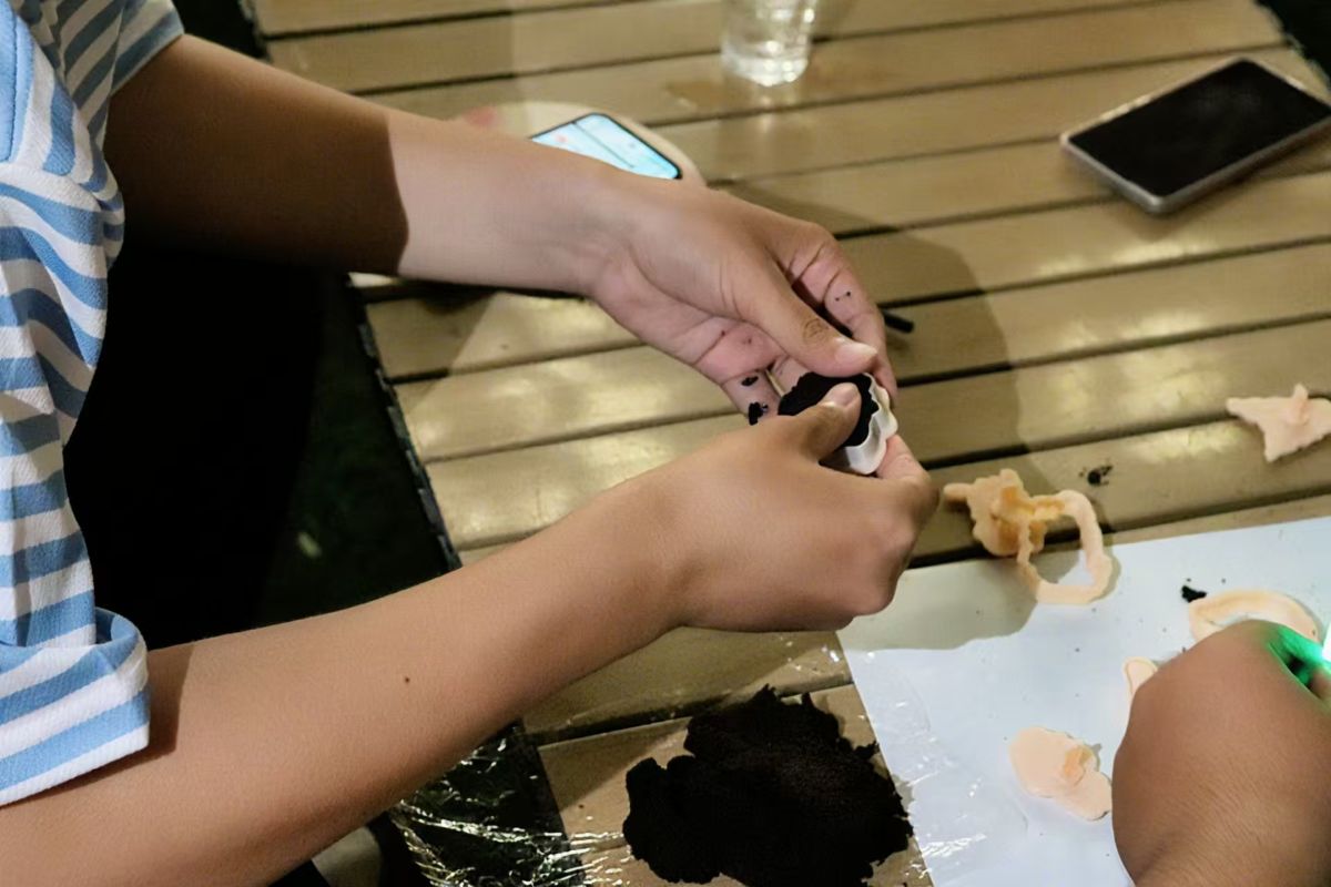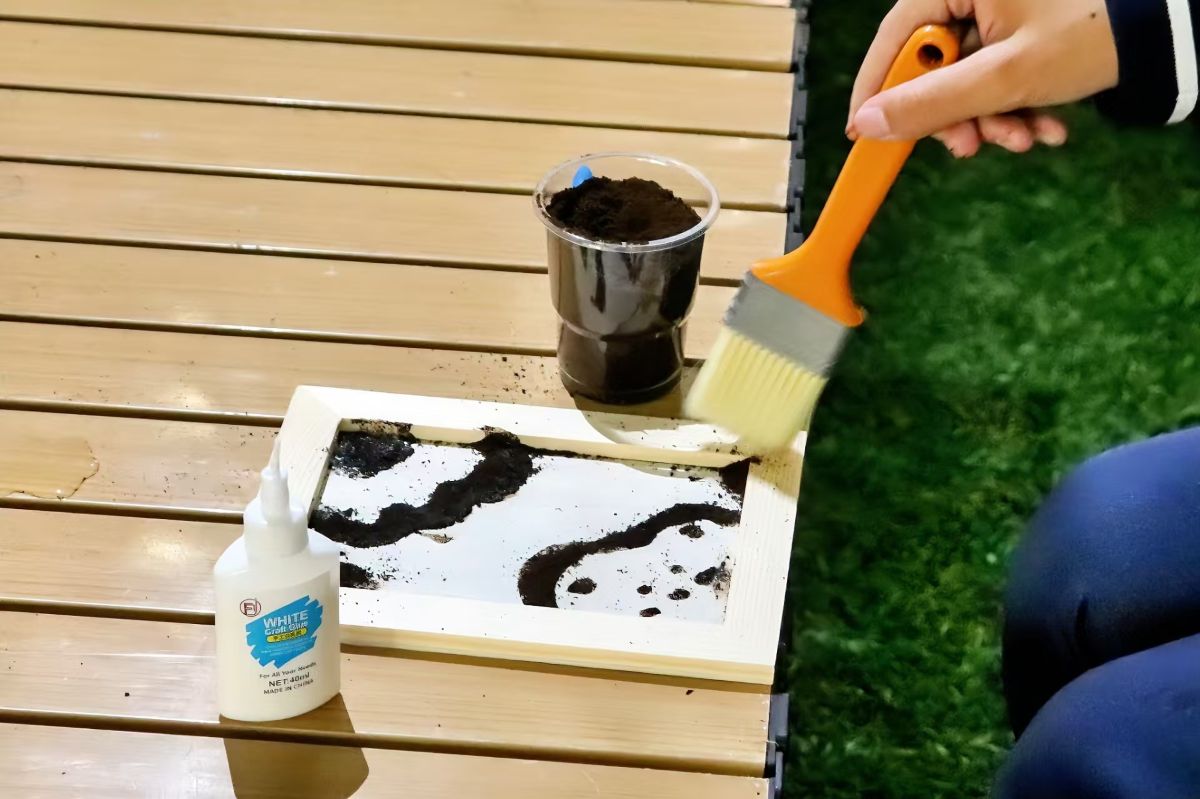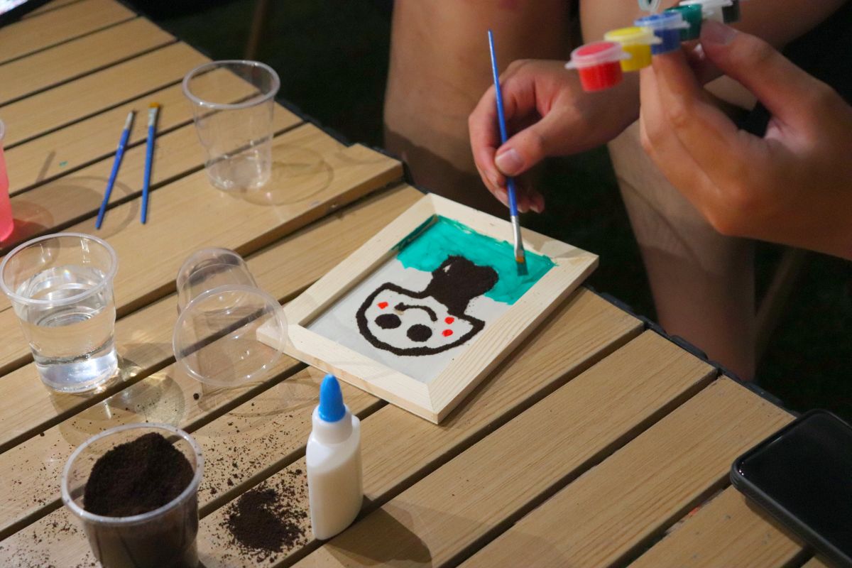 咖啡渣绘画区中,参与者通过黏合剂勾勒图案轮廓,利用干燥咖啡渣的天然棕褐色构建画面肌理,辅以水彩着色形成层次丰富的艺术作品。