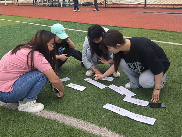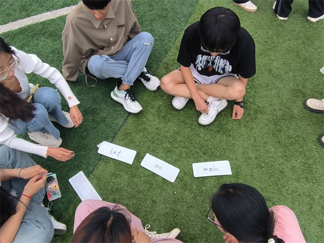 第二环节中,在主持人读出一个单词后,在固定时间内参赛队伍在保护所属队伍关键单词不被撕掉的同时,撕掉对手相应单词。经过前两环节的激烈追逐,比赛很快来到了第三环节,各参赛队伍集合整理未被撕掉的名牌,并组成句子。在第三轮中,各队伍之间的实力差距逐渐显现,比赛也变得更加紧张刺激。同学们充分发挥了自己的实力和智慧,展现出了更加精彩的比赛场面。