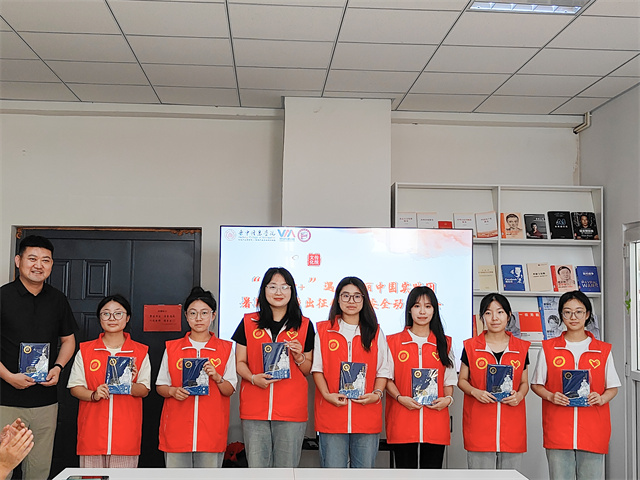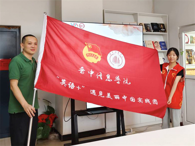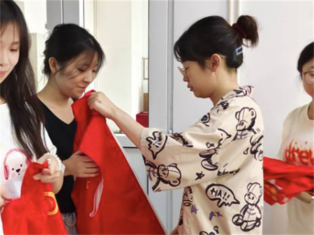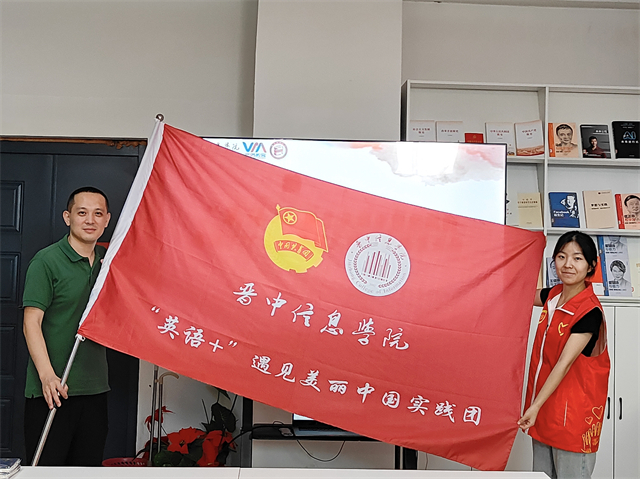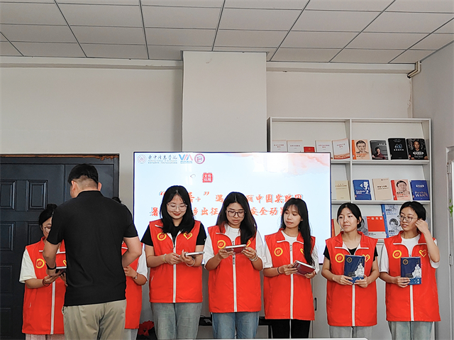仪式的高潮部分,张瑞芸老师代表学院向每位出征队员授予了象征责任与使命的红马甲。红马甲在晨光中熠熠生辉,仿佛一团团火焰,点燃了青年学子心中的激情与梦想。杜老师亲手将一本本精美的笔记本交到队员手中,这不仅是知识的载体,更是对大家寄予的厚望——愿每位学子都能记录下这段难忘的经历,收获成长的喜悦与智慧的火花。活动最后进行了授旗仪式。今天,“英语+”遇见美丽中国实践团接过这面旗帜,就是接过了继续前行的力量,希望各位成员可以携手并进,共同创造一个更加辉煌的未来,不忘初心,砥砺前行。