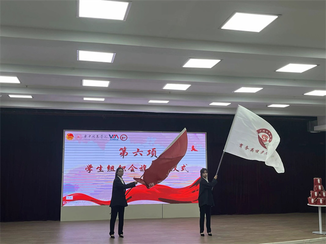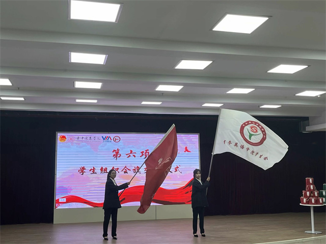 第十二届学生会执行主席武妍与第十一届学生会执行主席王月交接学生组织会旗与院旗,接下一份传承,赓续一种精神。