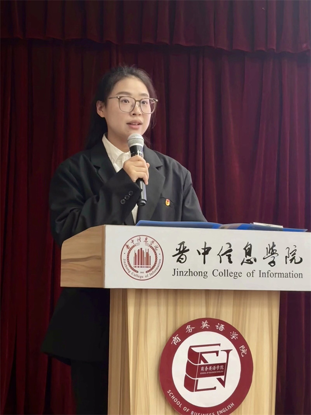 国歌声下,心中那份青春的火焰已熊熊燃起,坚定的信念深深烙印在心底。商务英语学院师生共同见证了这个传承与接棒时刻。商务英语学院第十一届学生会执行主席王月首先进行工作汇报,她以“播撒、蜕变、绽放、收获”为主线任务,带领团队于完满教育中踔厉奋发,屡创佳绩。