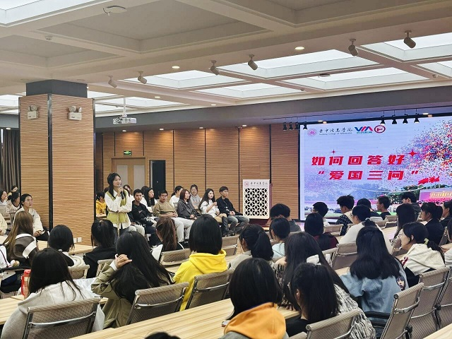 10月22日,商务英语学院辅导员郭凯英老师在多功能报告厅举办了“如何回答好‘爱国三问’”的辅导员说完满活动。