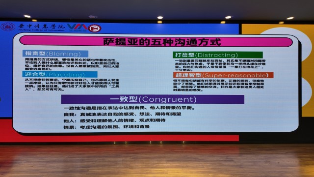 张老师通过情景演绎,强调有效沟通的重要性,给同学们介绍了萨提亚的五种沟通方式:指责型、打岔型、迎合型、一致型以及超理智型,五种沟通方式各有特点,张老师逐一进行了讲解,同时帮助同学们树立正确有效的沟通方式。