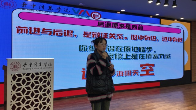 张老师通过展示起跑姿势和插秧形式和大家探讨“后退原来是向前”。她讲到在我们成长过程中,我们有的时候可能觉得跟不上时代的步伐,有时候觉得不是很顺畅地前进,感觉“磕磕绊绊”。这个东西不重要,我们要明白后退与向前的辩证关系,退中有进,进中有退,有时候我们总觉得在原地踏步,但实际上是在积蓄力量。张老师激励我们不因一时不顺而气馁,要矢志奋斗,厚积而薄发。
