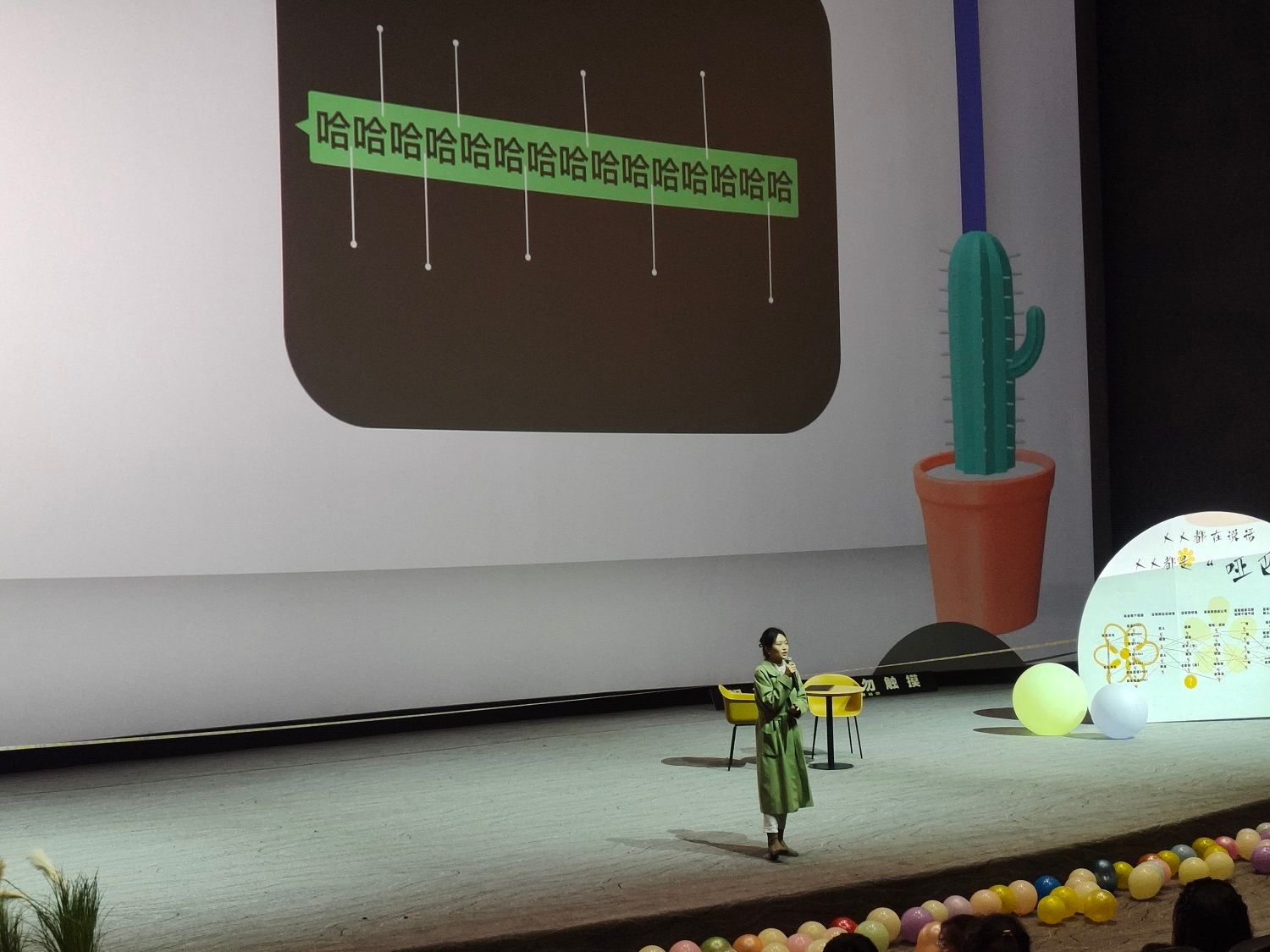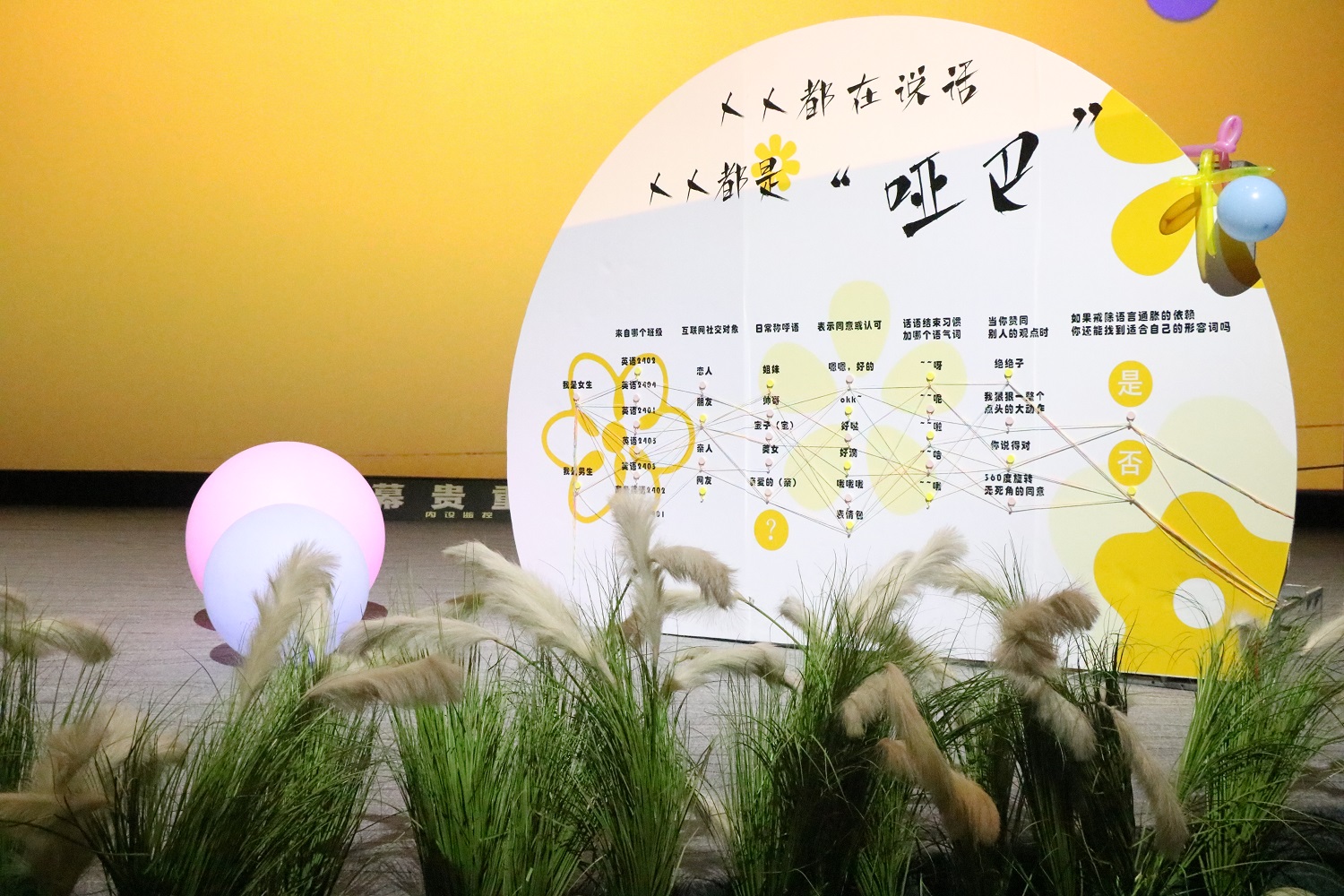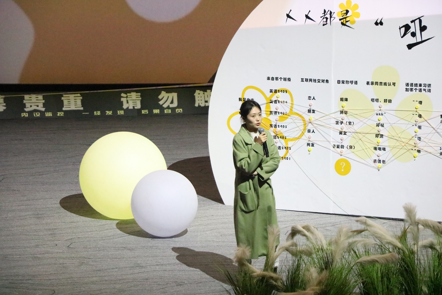 互动之后,郭凯英老师引出“语言的通货膨胀”这一概念,语言的使用变得过量过度,却没有相应的情感、思想作支撑,导致语言本身的价值贬损。为了让同学们更直观地感受,老师邀请几名同学上台演示,道具KT板汇集了当下比较火的交流常用流行语及表达习惯,通过绕线的方式展示网络世界中如何称呼他人、用什么语言表达情绪和观点。在完成缠线环节后,请三位同学代表依据自己的表达习惯谈谈的想法,其中一位同学表示“很多梗之所以能流行起来一定有它的原因在,因为互相玩梗可以获得了情绪价值和情感收益,在我看来这就是值钱的。”