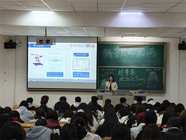 3月13日,商务英语学院辅导员郭凯英老师于2教401开展以“趁青春,燃就这Young”为主题的辅导员说完满活动。